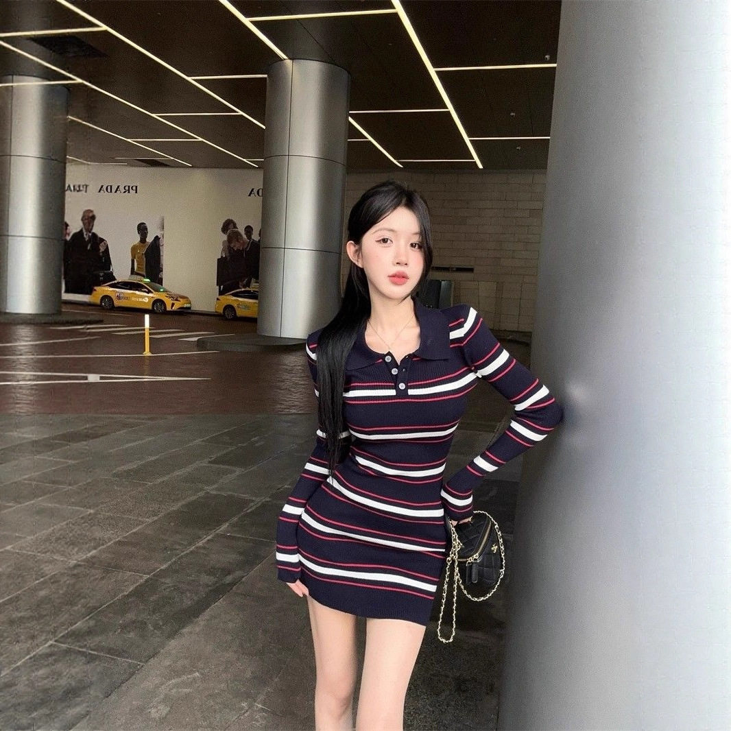POLO领条纹长袖显瘦百搭针织连衣裙女秋冬款修身包臀纯欲打底短裙