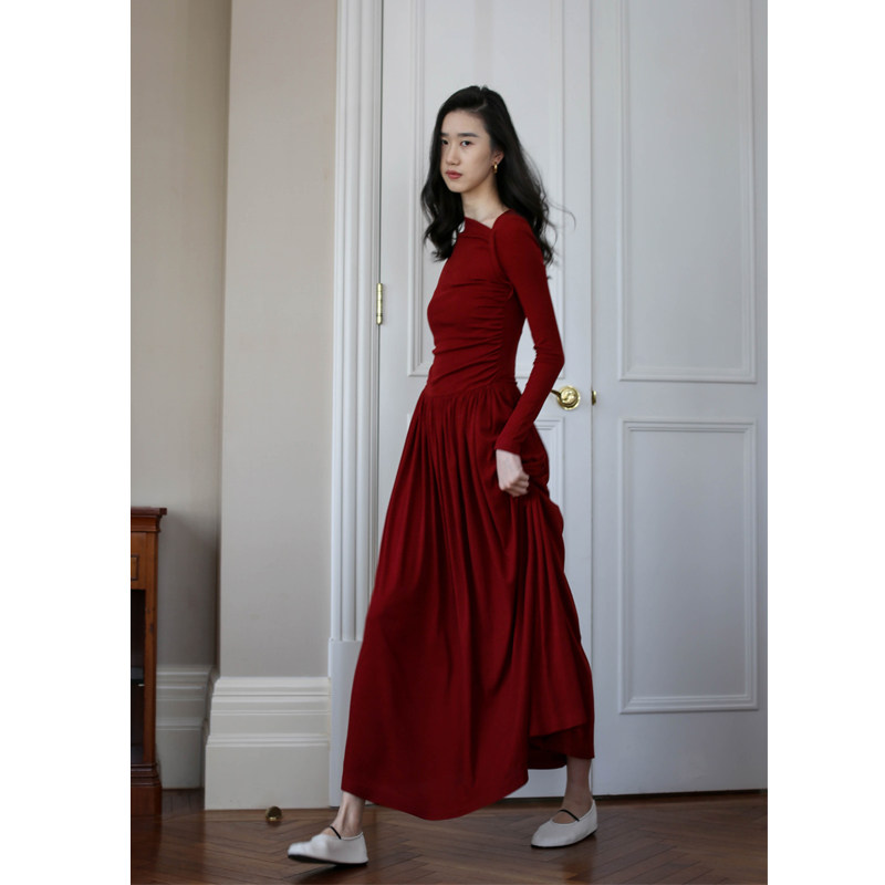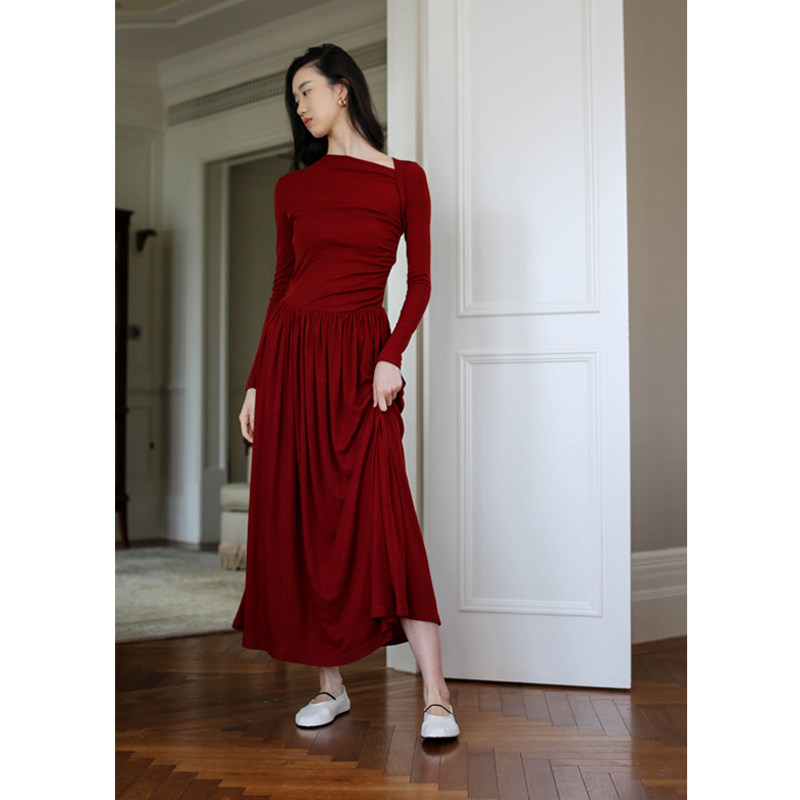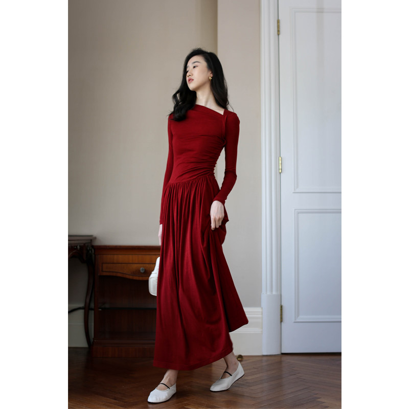无有无印红色长袖修身大摆显瘦斜襟领中长款弹力针织连衣裙23370
