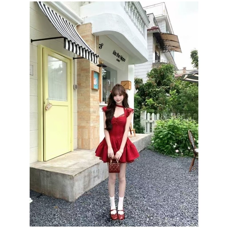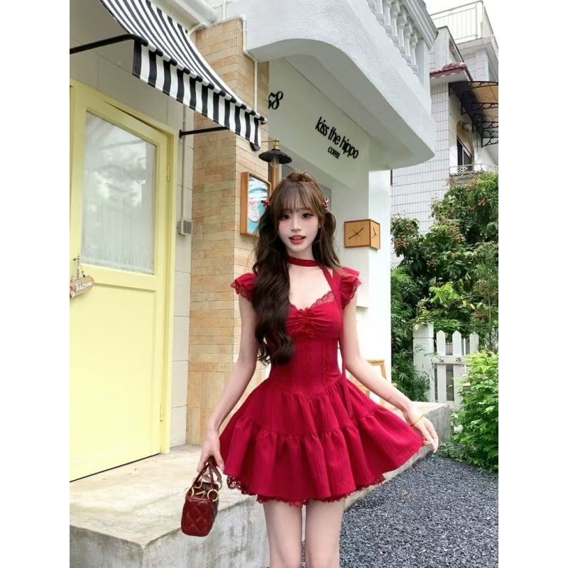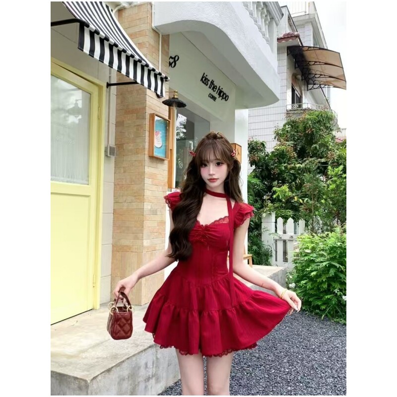 夏季甜美千金感度假风红色裙子拼接花边小飞袖收腰显瘦短款连衣裙