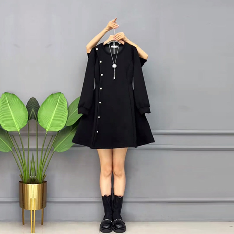 加肥女侧纽扣长袖收腰连衣裙胖妹妹中长款减龄显瘦设计感黑色裙子