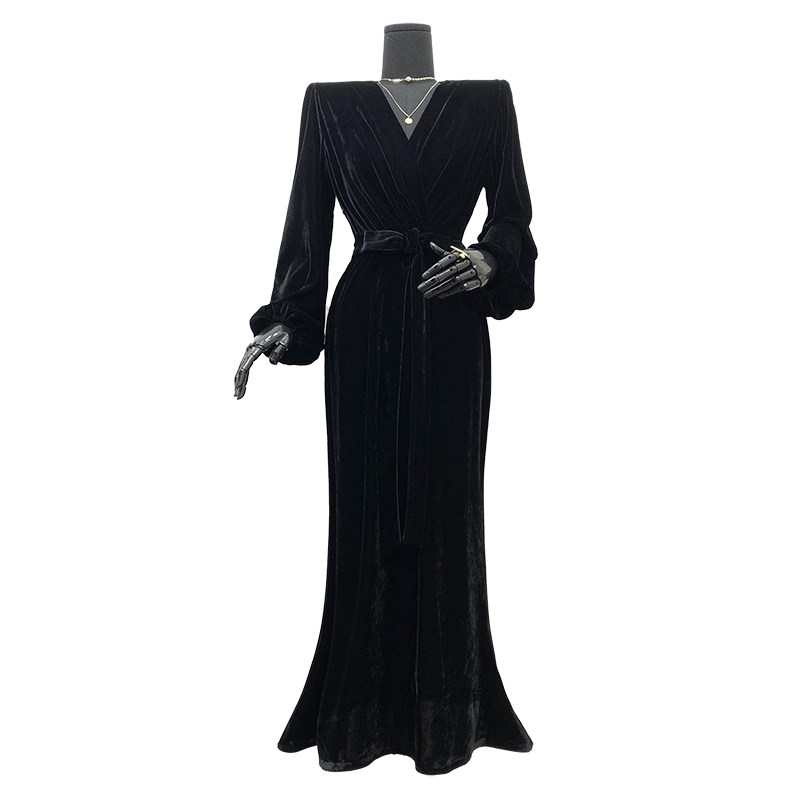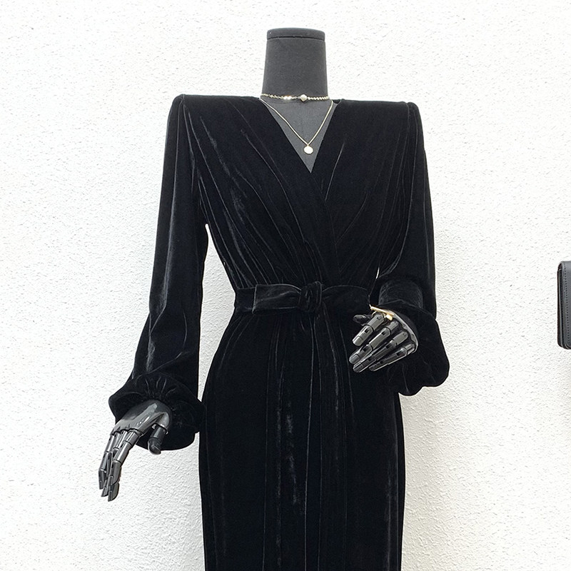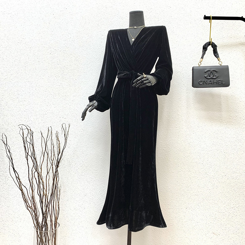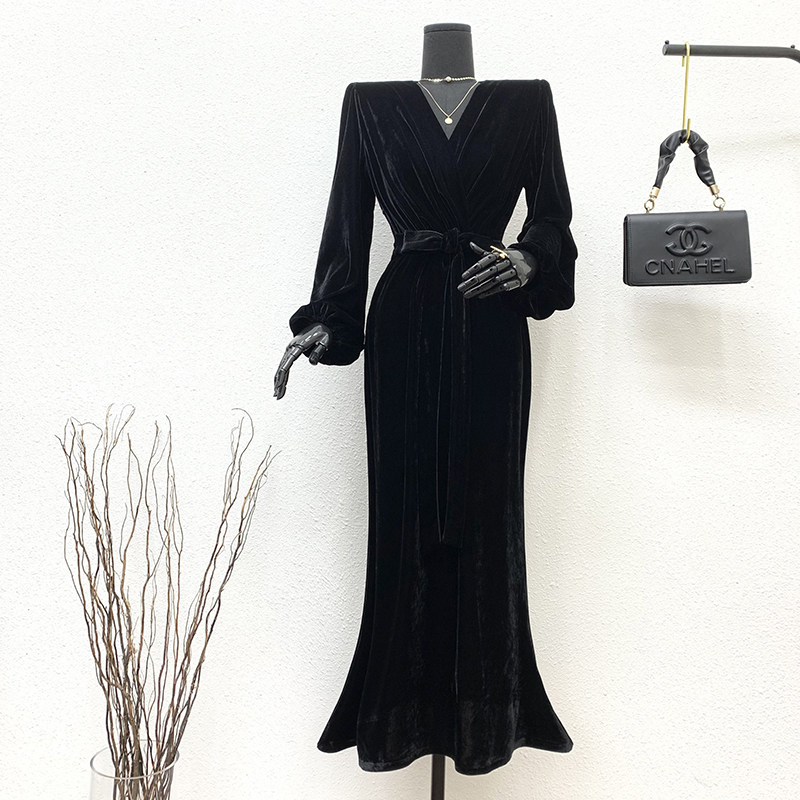 秋冬黑色灯笼袖丝绒长款连衣裙2025一字肩V领收腰遮肚包臀鱼尾裙