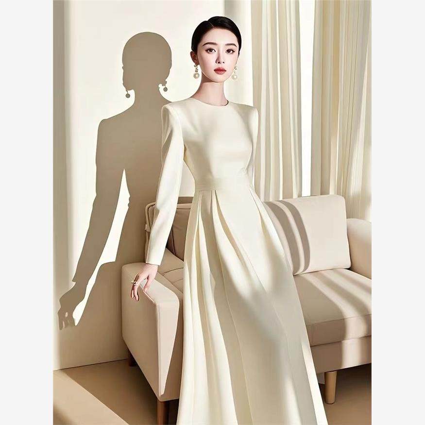 正式场合气质收腰小香风白色长袖连衣裙洋气高贵小个子长裙早秋季