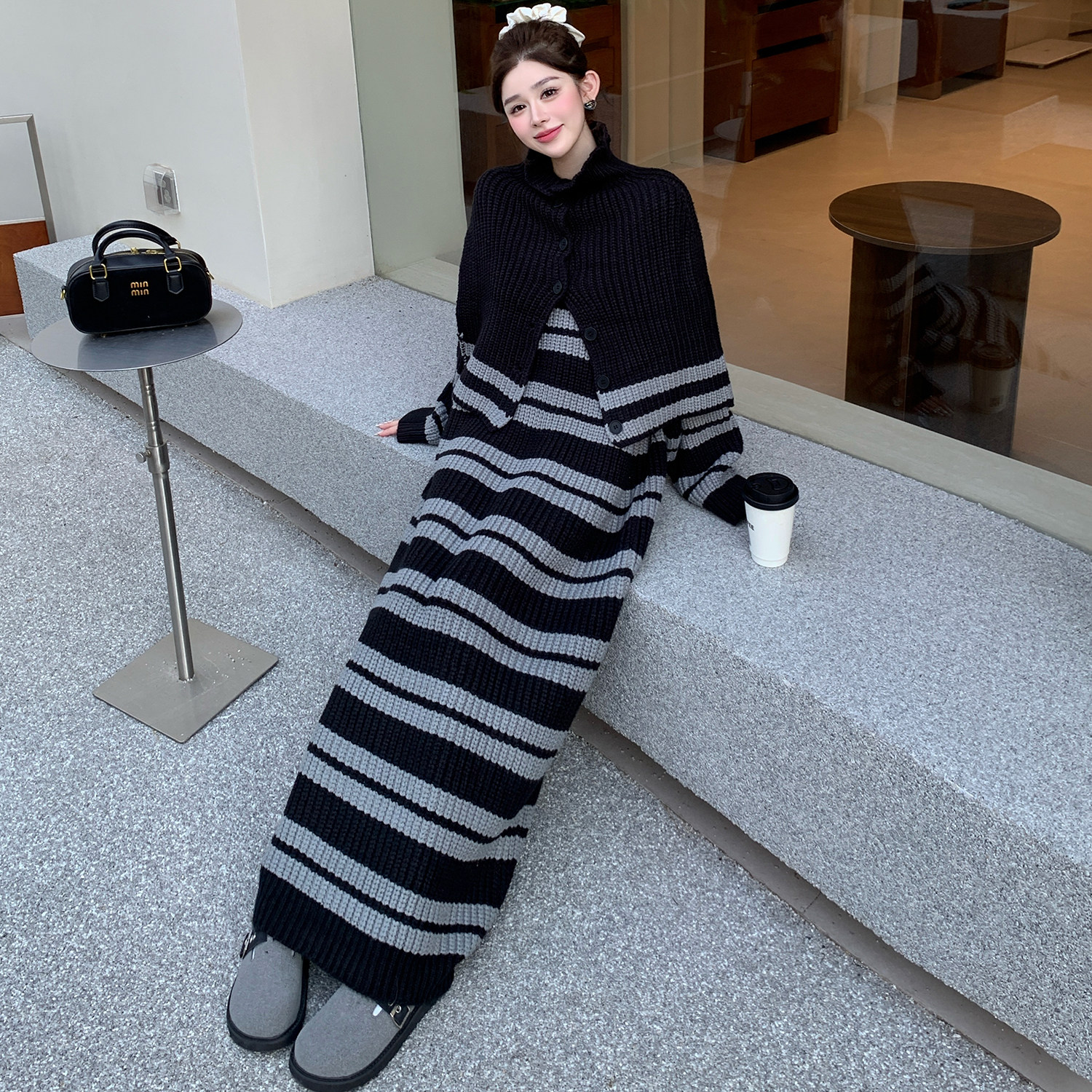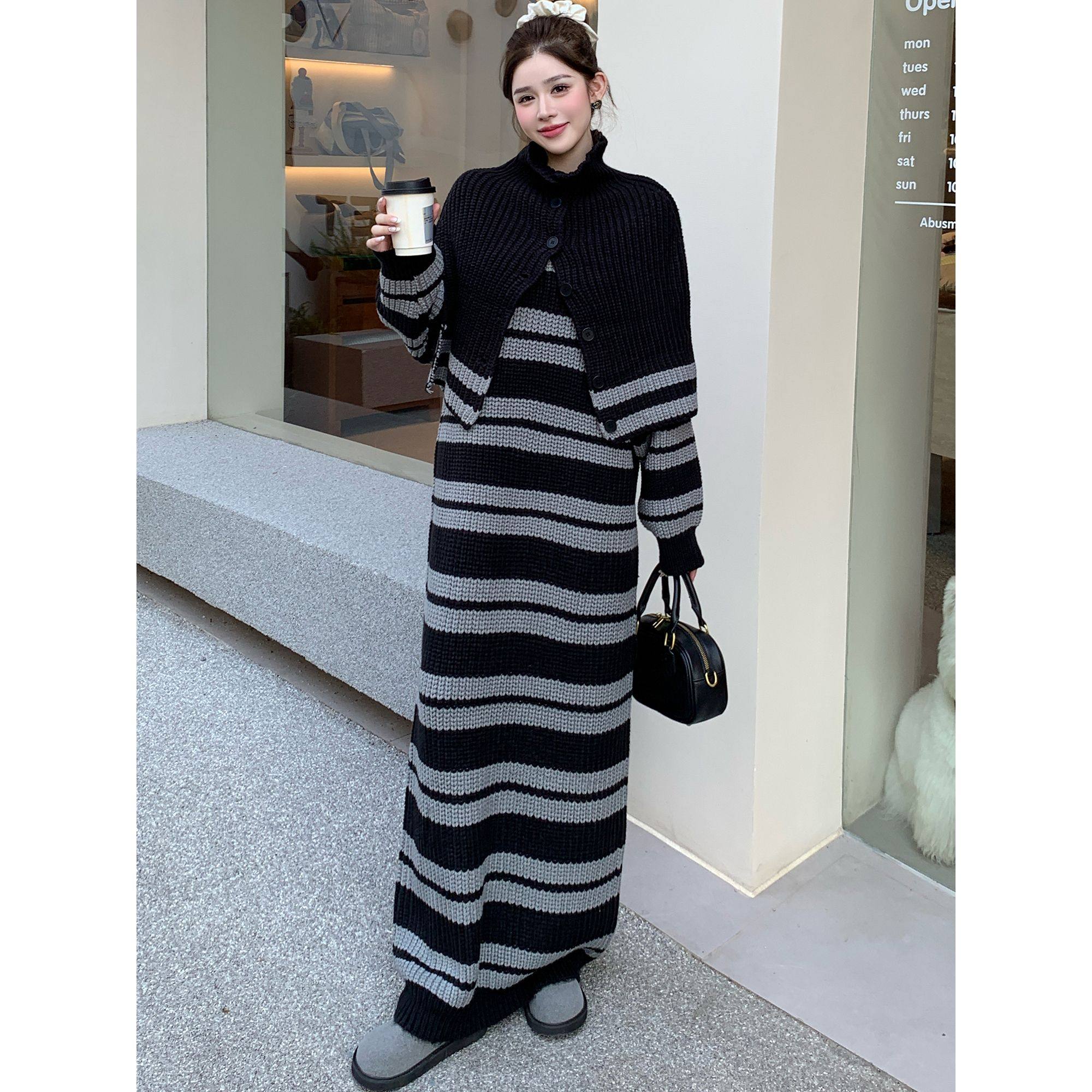 秋冬季新款大码女装胖mm宽松显瘦条纹过膝连衣裙长款遮肉毛衣裙
