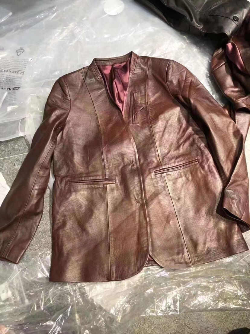 欧洲站2023秋季新款进口绵羊皮无领廓形绵羊皮真皮西装皮衣外套女