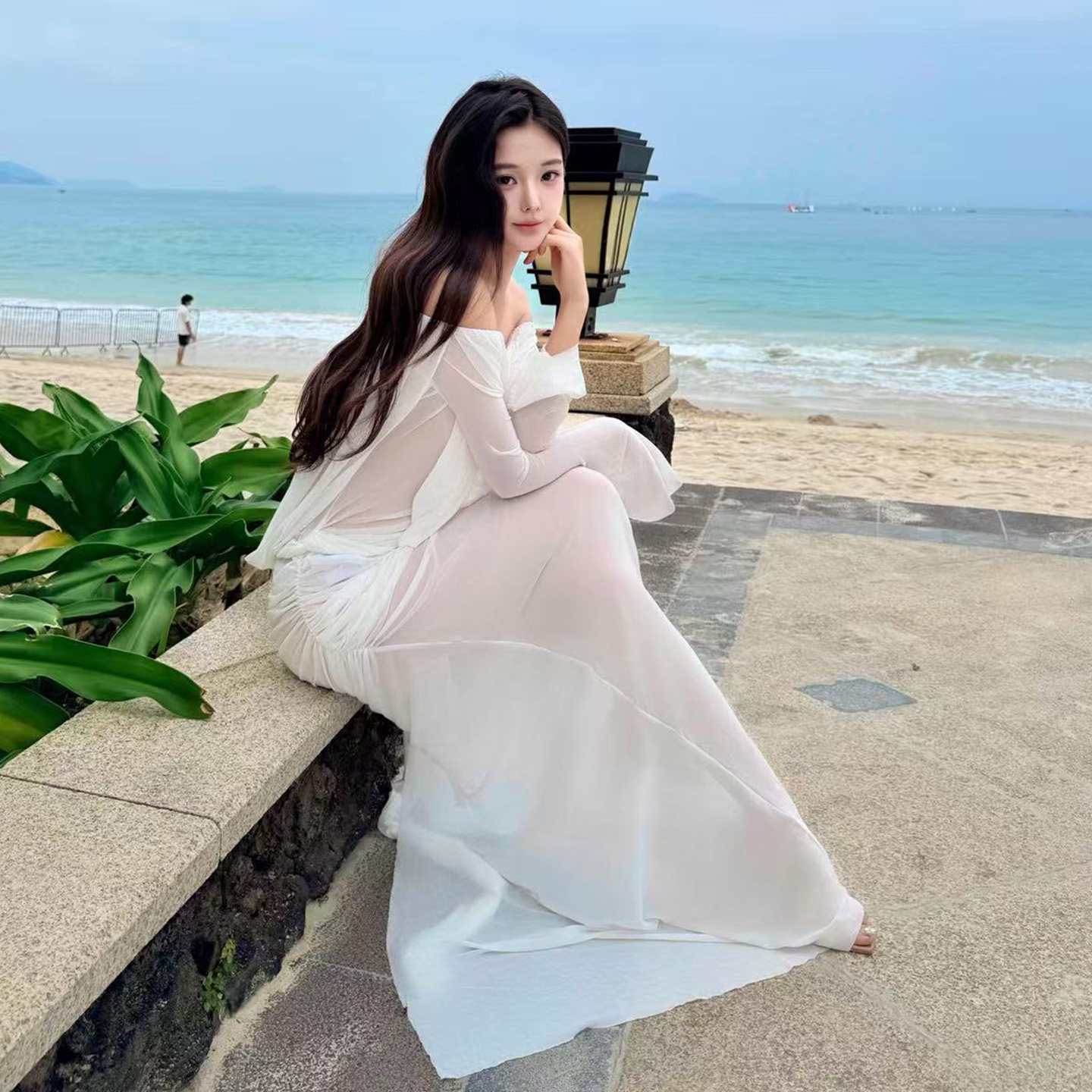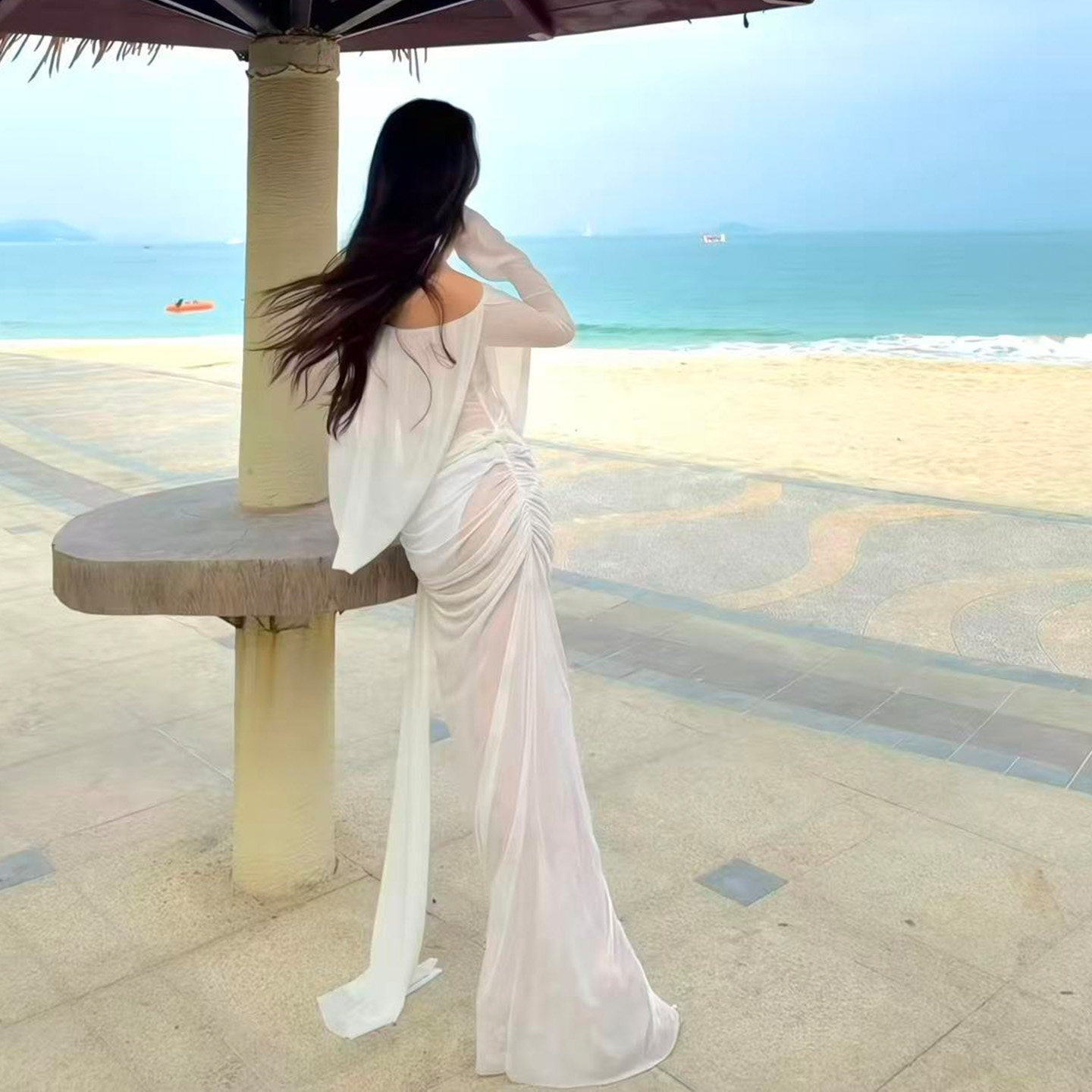 新款白色仙气长袖露肩连衣裙开叉性感海岛度假沙滩旅行长裙泳衣女
