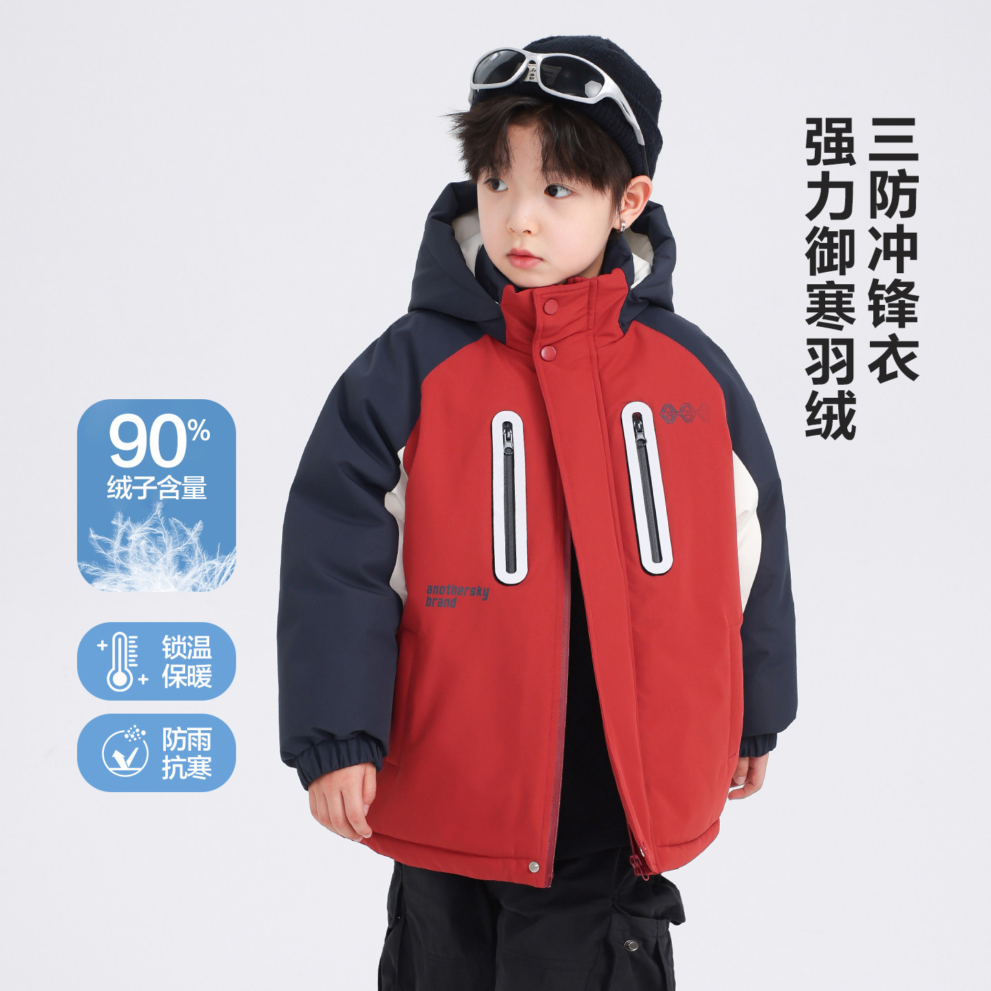 男童冬季红色新年冲锋衣羽绒服2026新款儿童男孩撞色加厚防寒外套