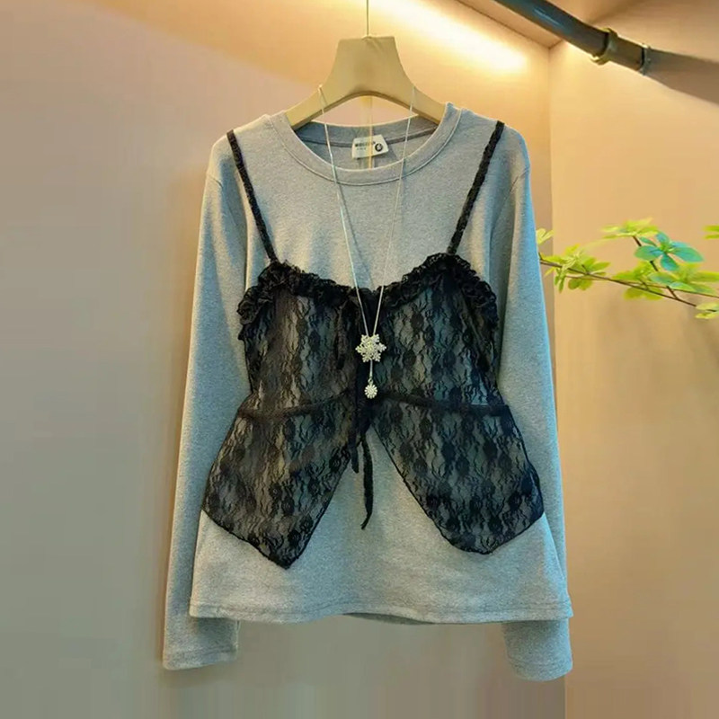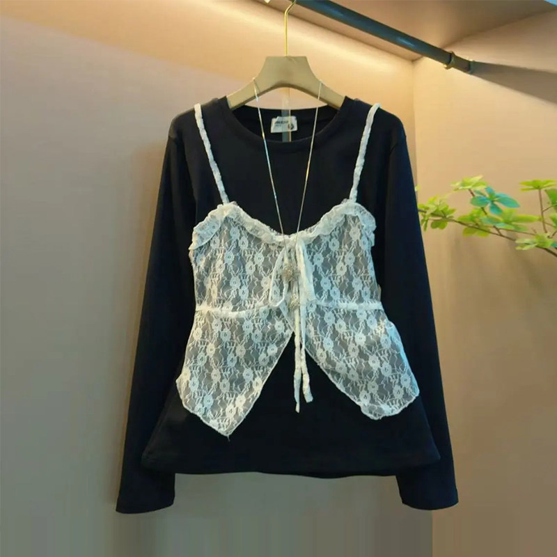 大码女装拼色蕾丝吊带假两件上衣胖妹妹韩版2026早春新款百搭小衫