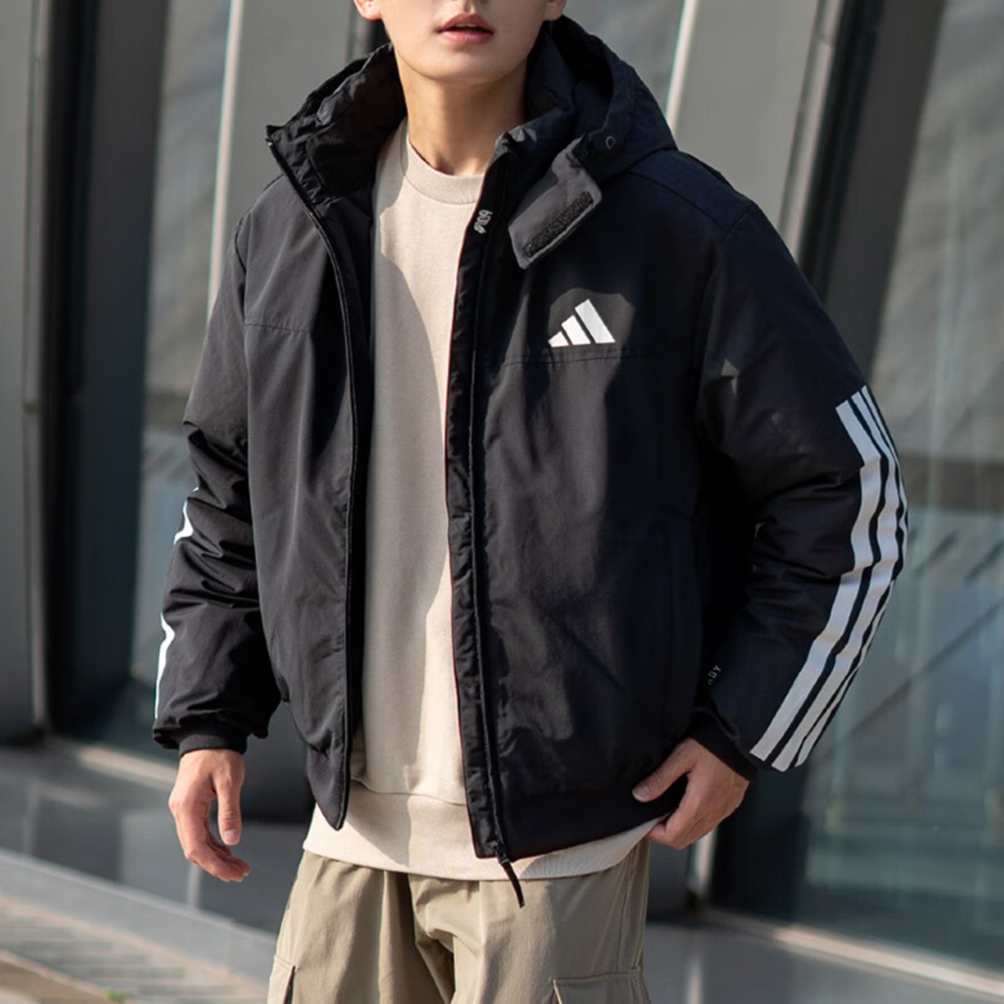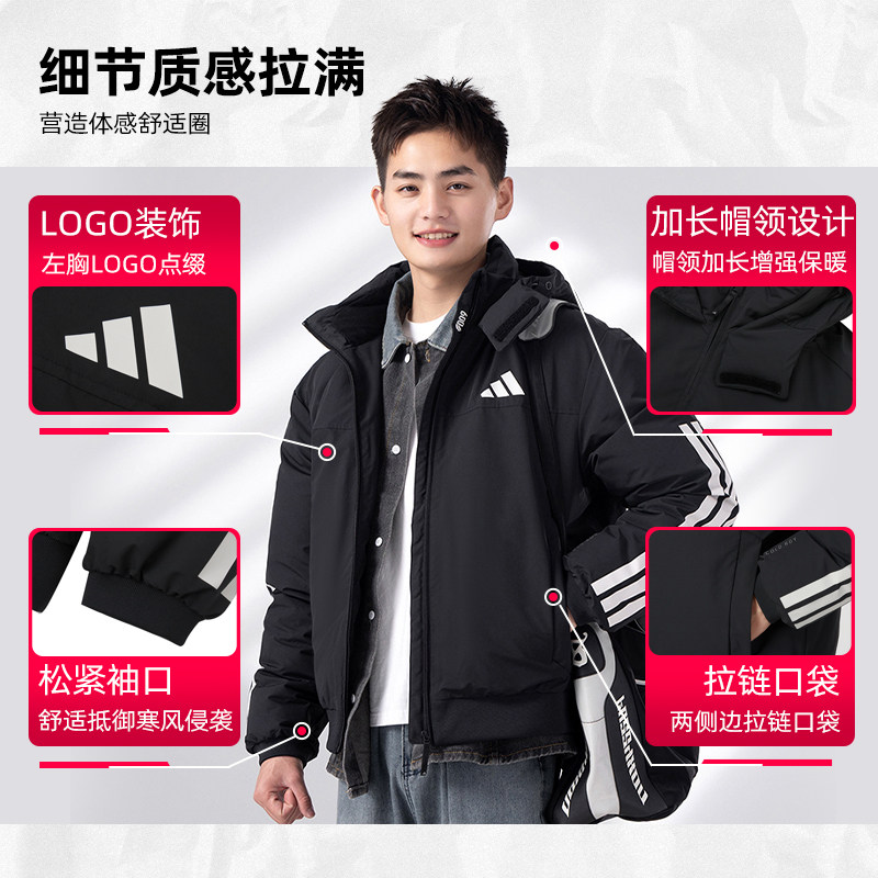 阿迪达斯羽绒服男款官方正品黑色加厚保暖夹克连帽运动棉服外套男