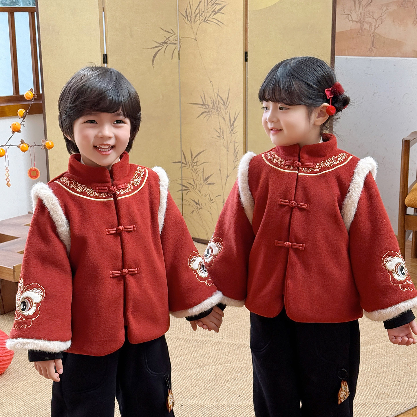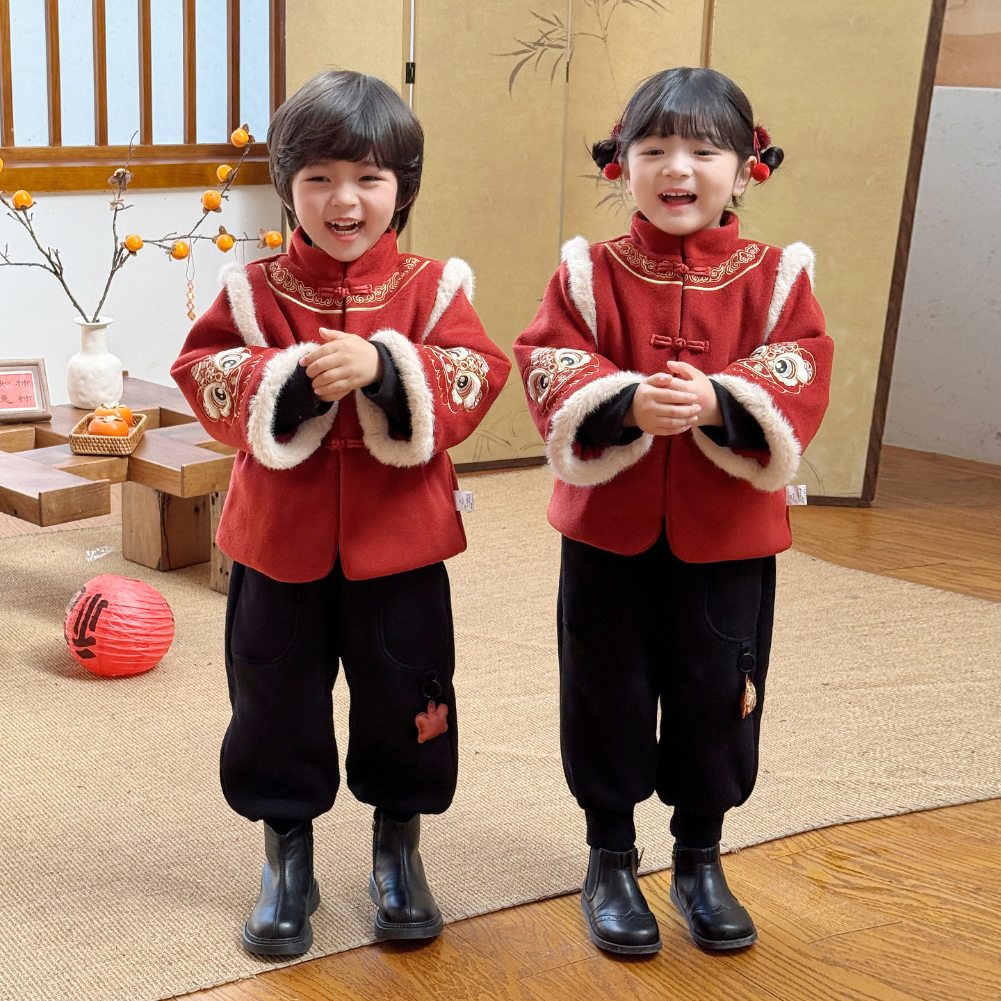 儿童拜冬年服喜庆风男童新中式国风唐装女童过年衣服红色套装加厚
