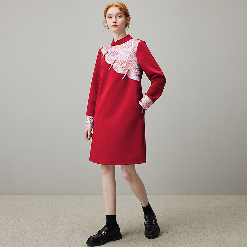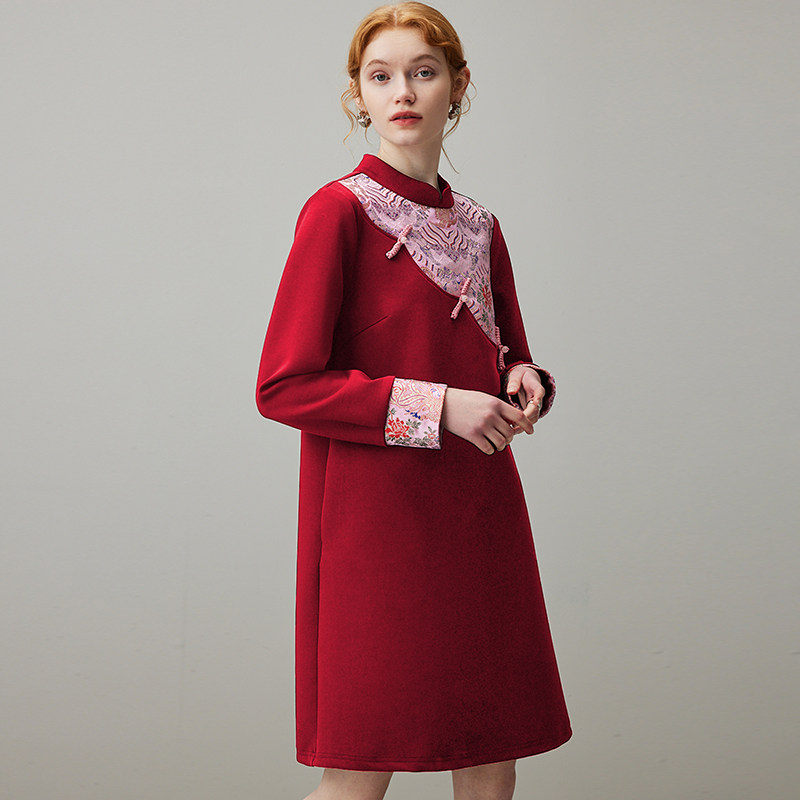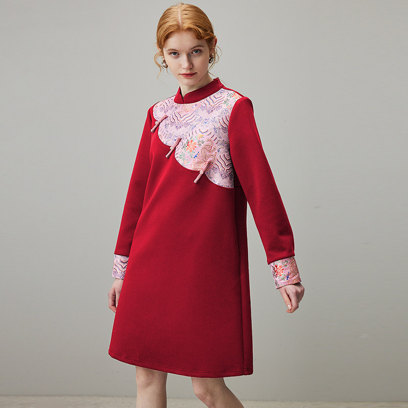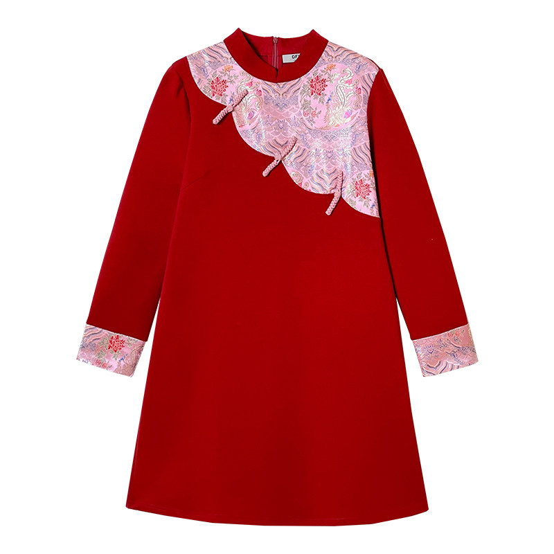 dfvc红色宫廷风连衣裙女春季2026新款重工刺绣宽松直筒小个子裙子
