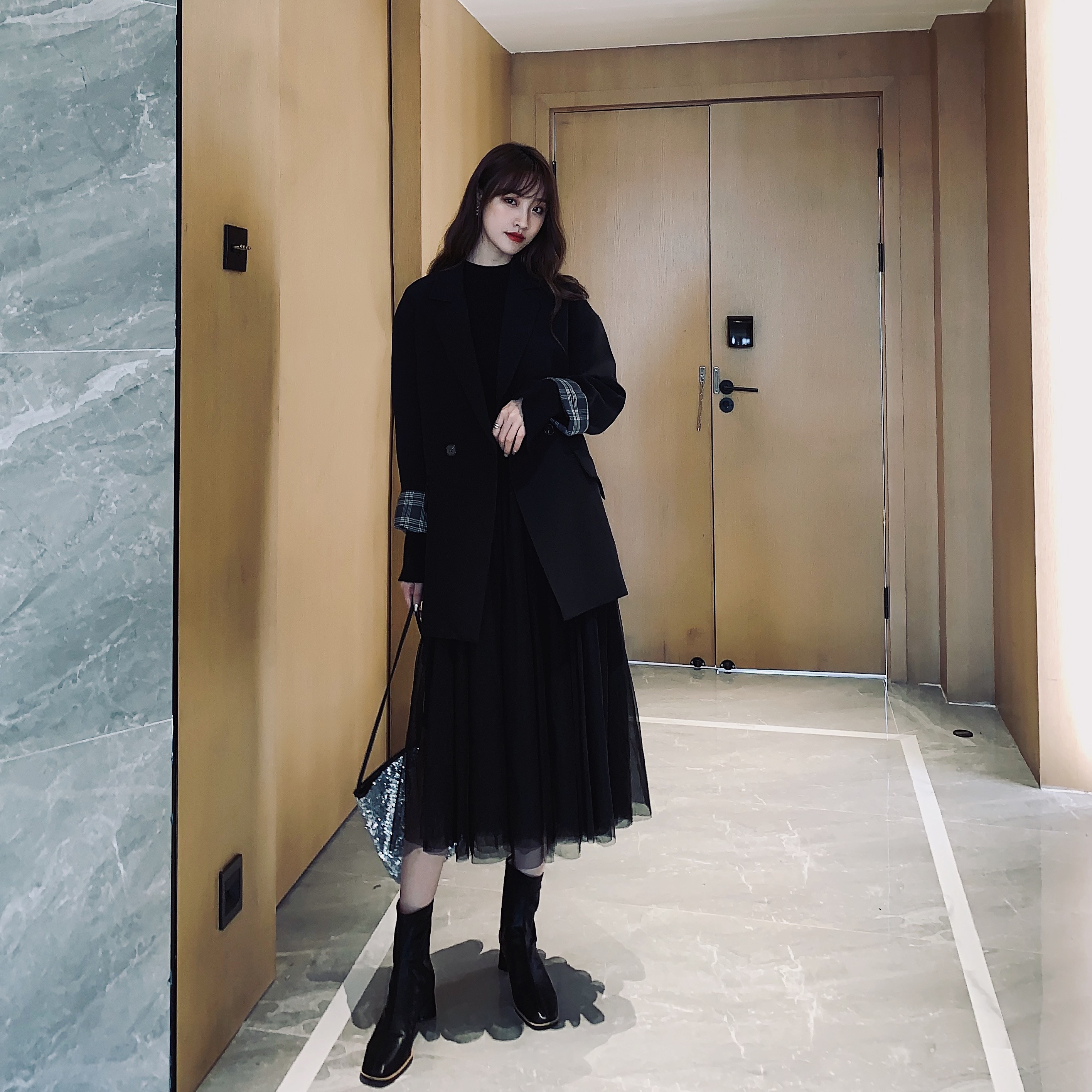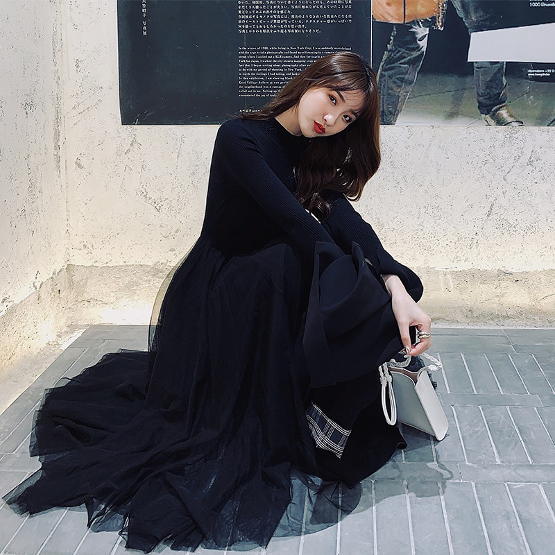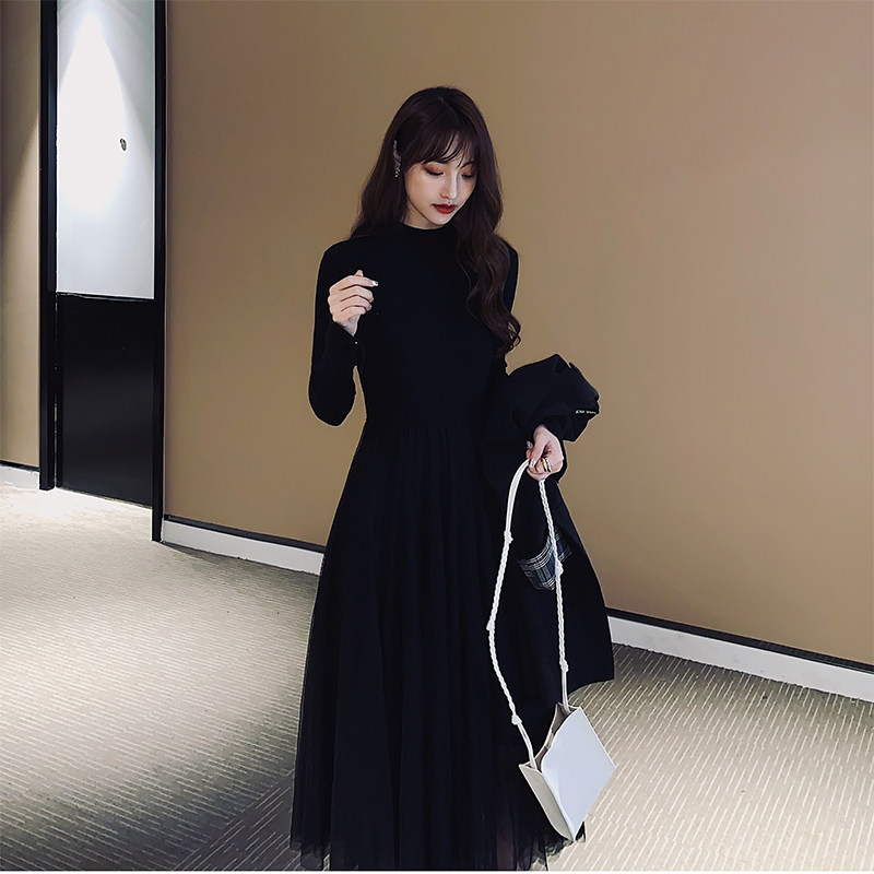赫本配大衣的网纱拼接打底黑色针织连衣裙女内搭中长款过膝秋冬季