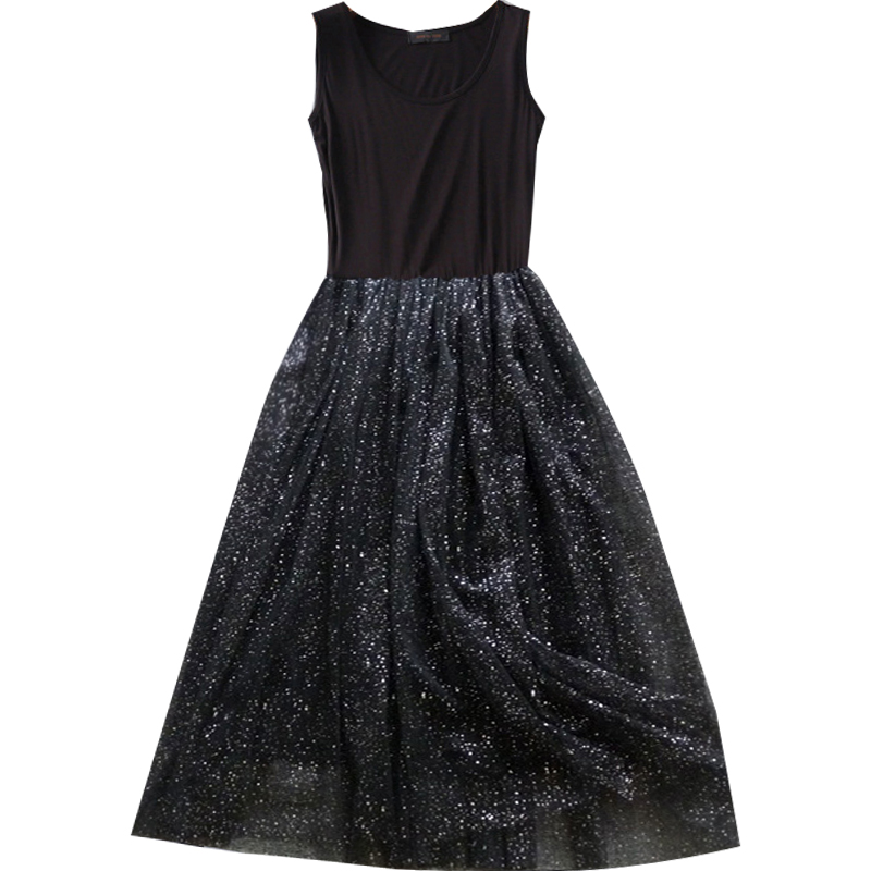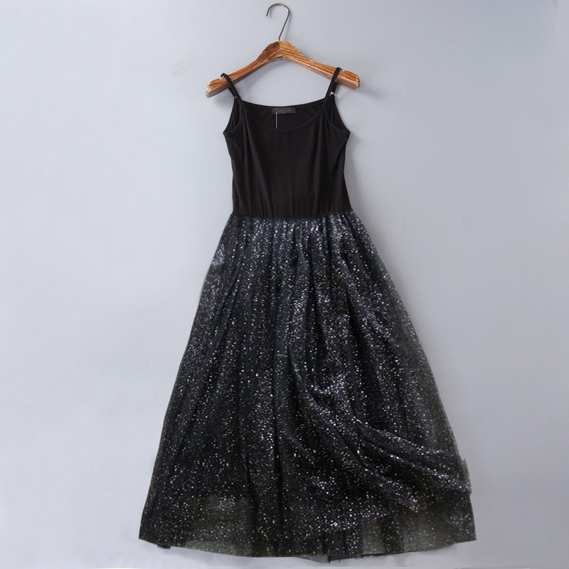 2025新款秋冬背心吊带纱裙长款内搭蕾丝网纱满天星黑色打底连衣裙