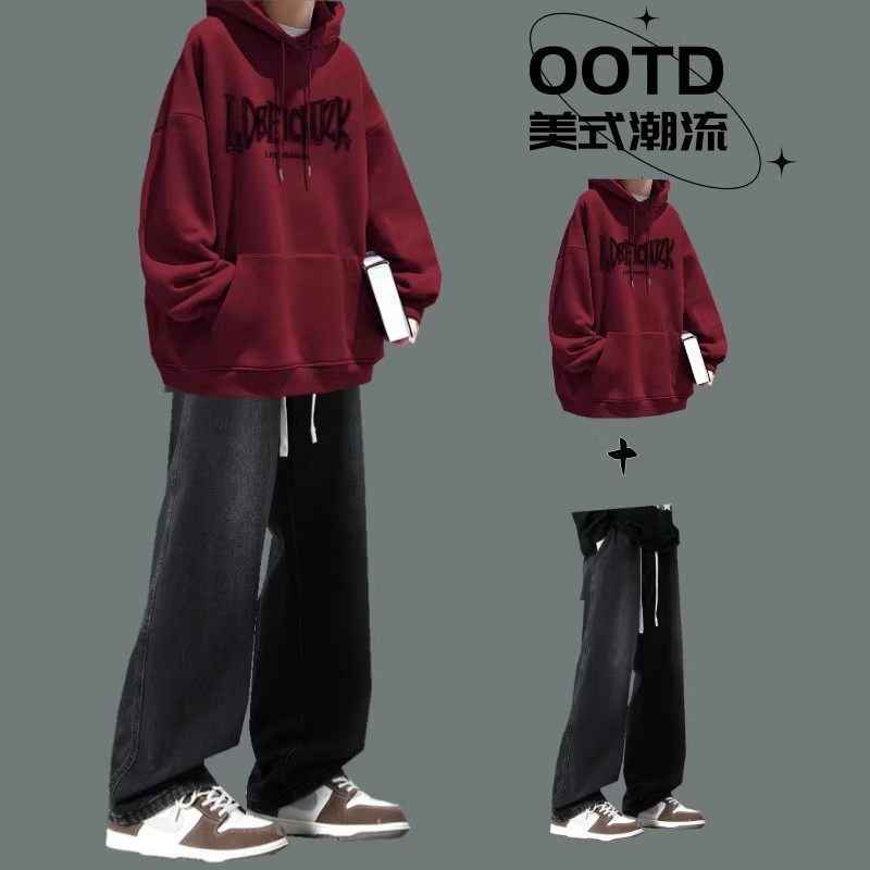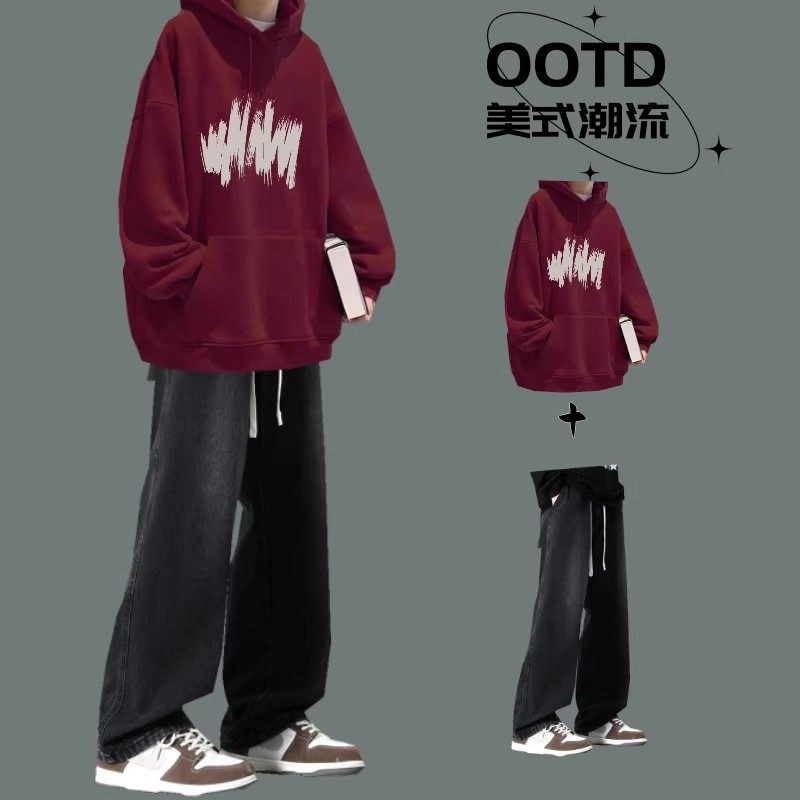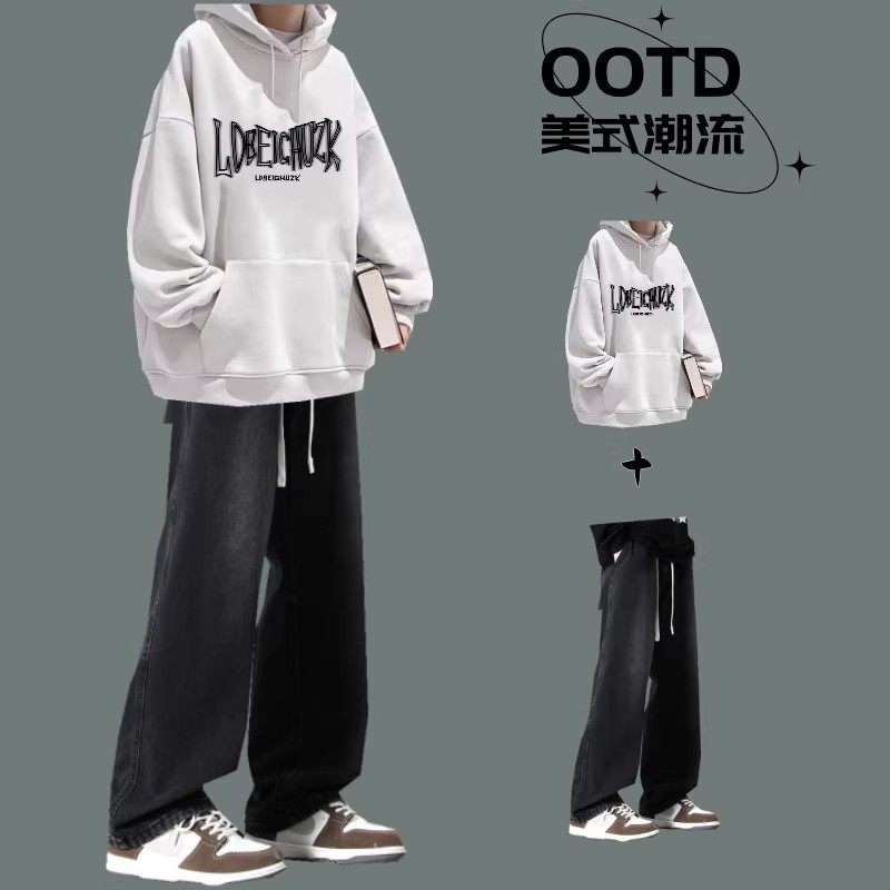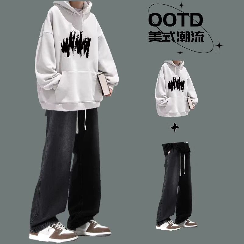 秋冬季男生连帽卫衣套装青少年帅气一套搭配时髦牛仔裤男装两件套