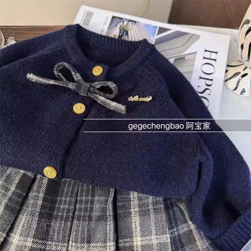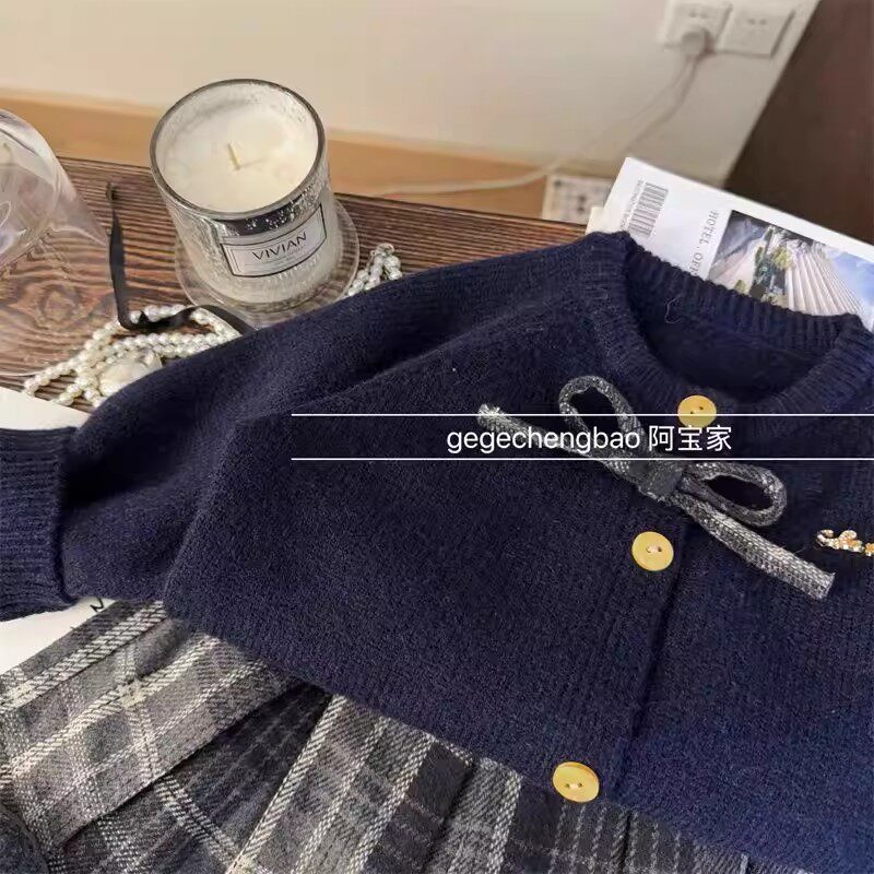 韩版女童2026秋冬新款藏蓝色蝴蝶结针织毛衣女孩格纹百褶裙两件套