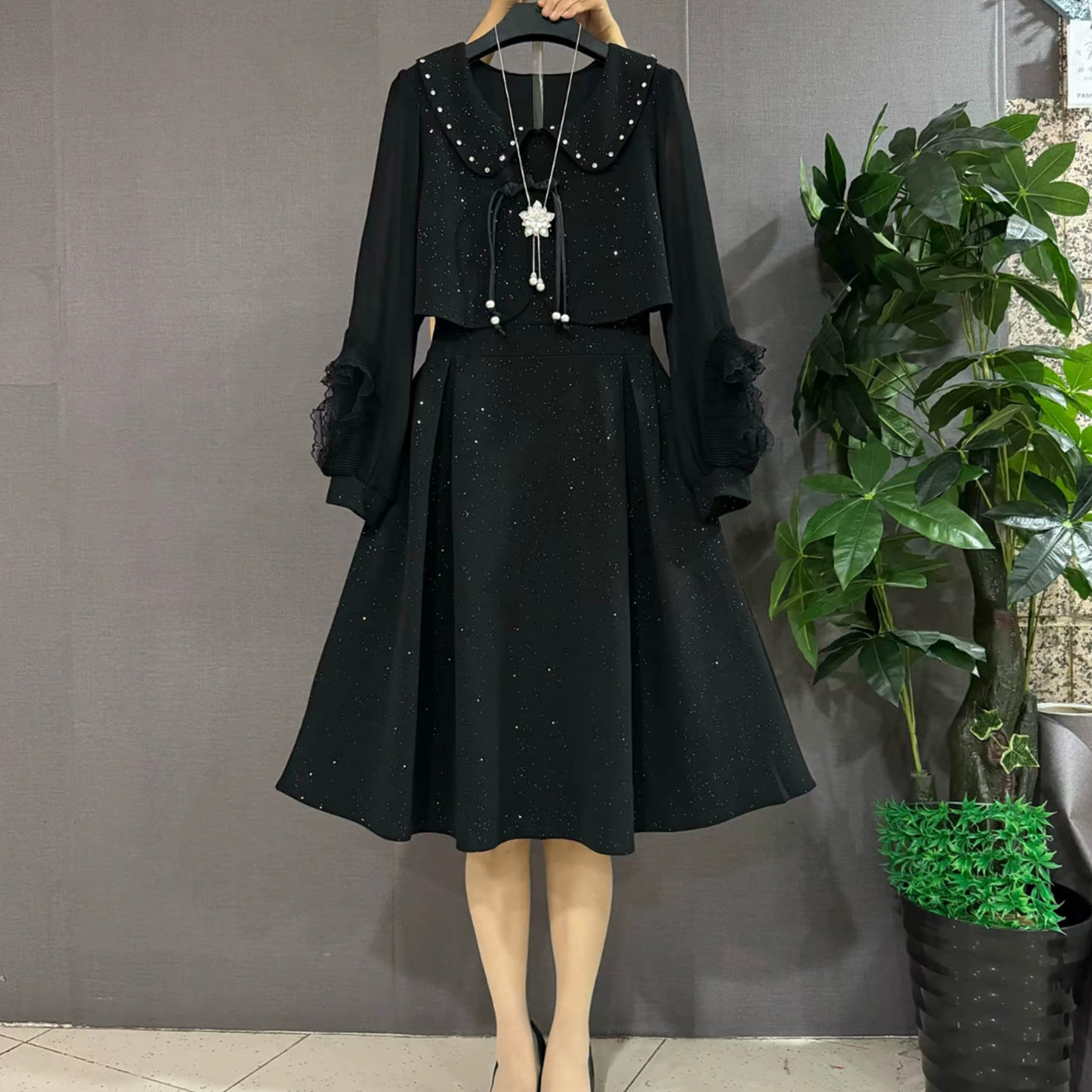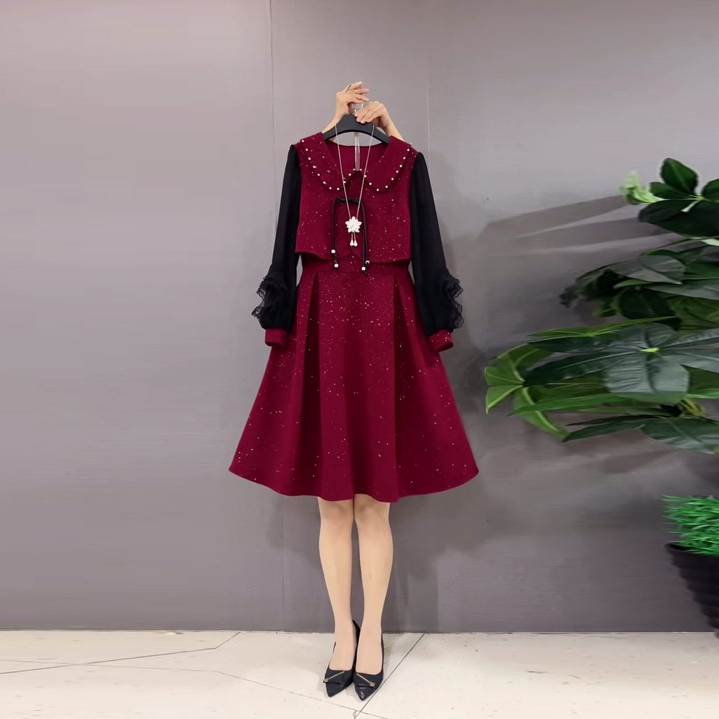 加肥翻领拼色长袖收腰连衣裙胖妹妹气质长款轻熟风显瘦秋冬款裙子