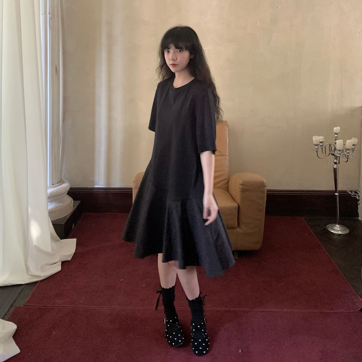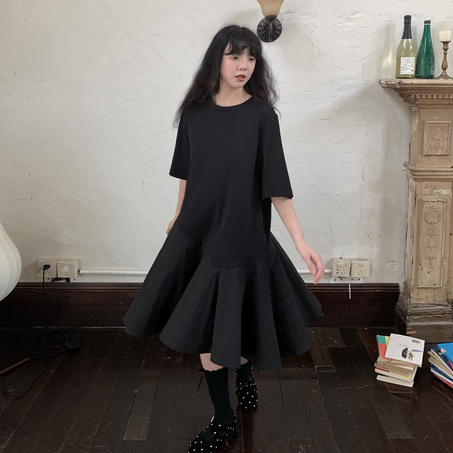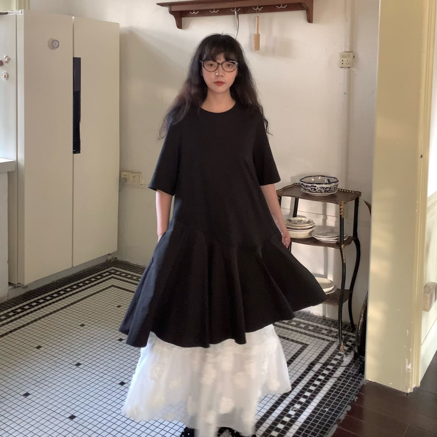 陆与山屿【古渡】五分袖下摆拼接面料连衣裙黑色气质夏日通勤长裙