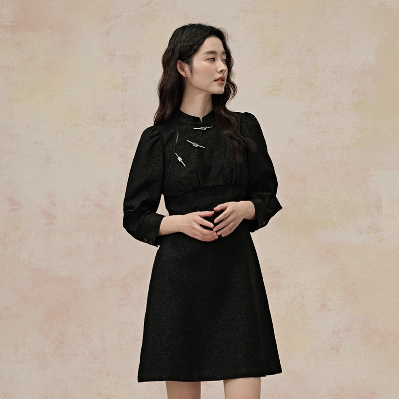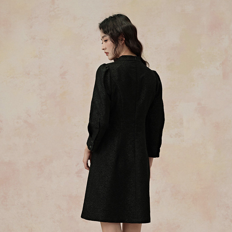 PIT新中式国风黑色立领中袖连衣裙女2025秋收腰A字提花中长裙
