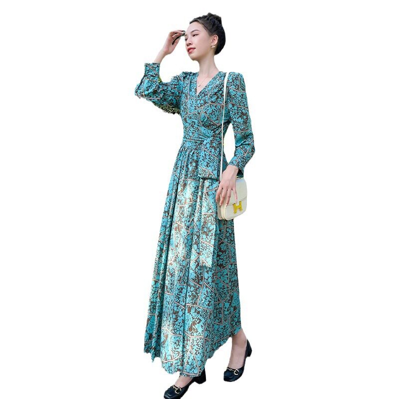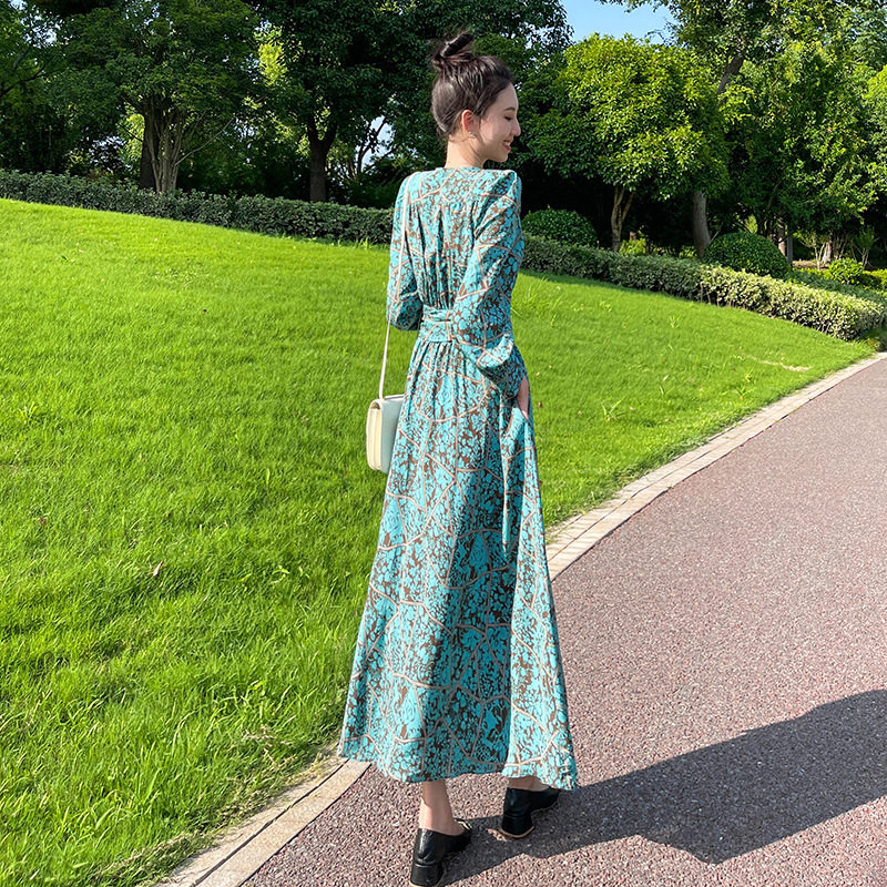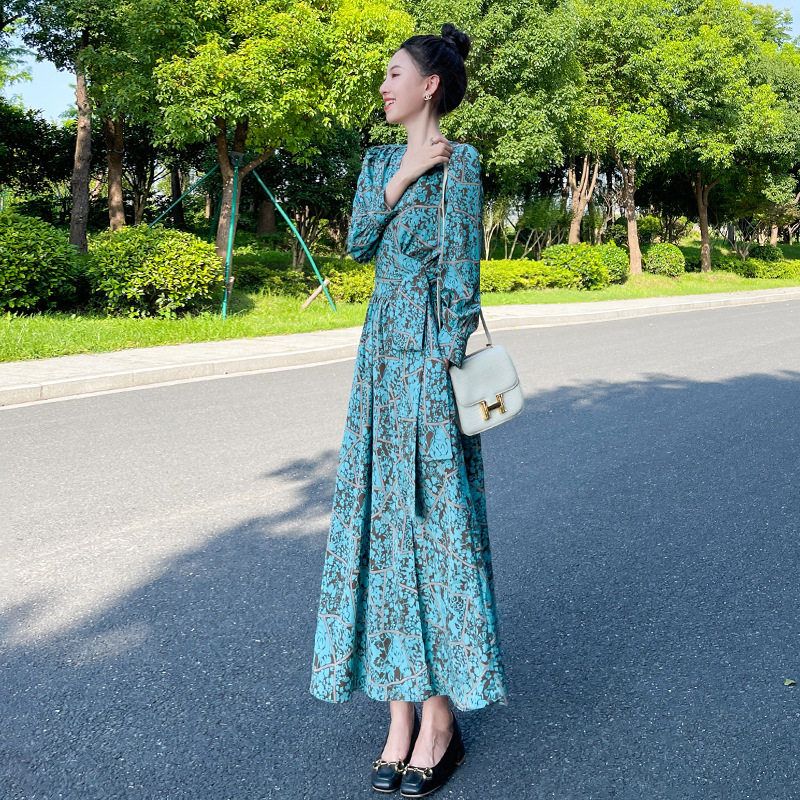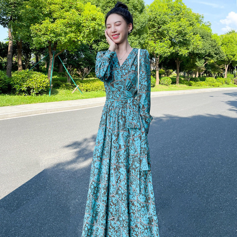 欧美碎花长袖连衣裙女春秋新款法式裹身长款桔梗裙收腰雪纺长裙