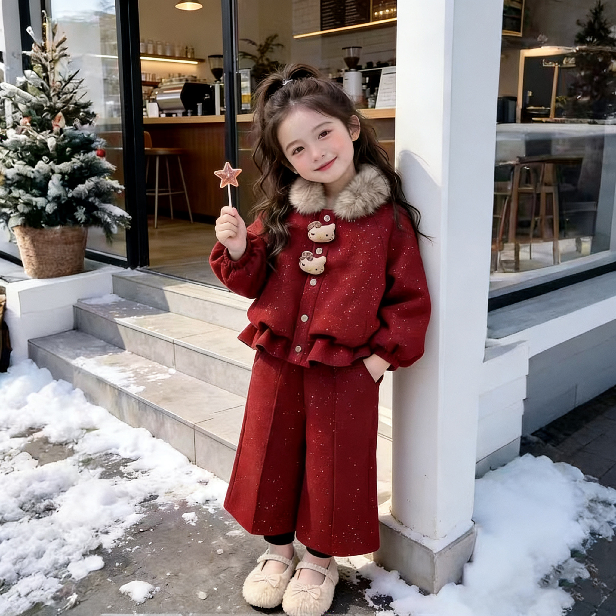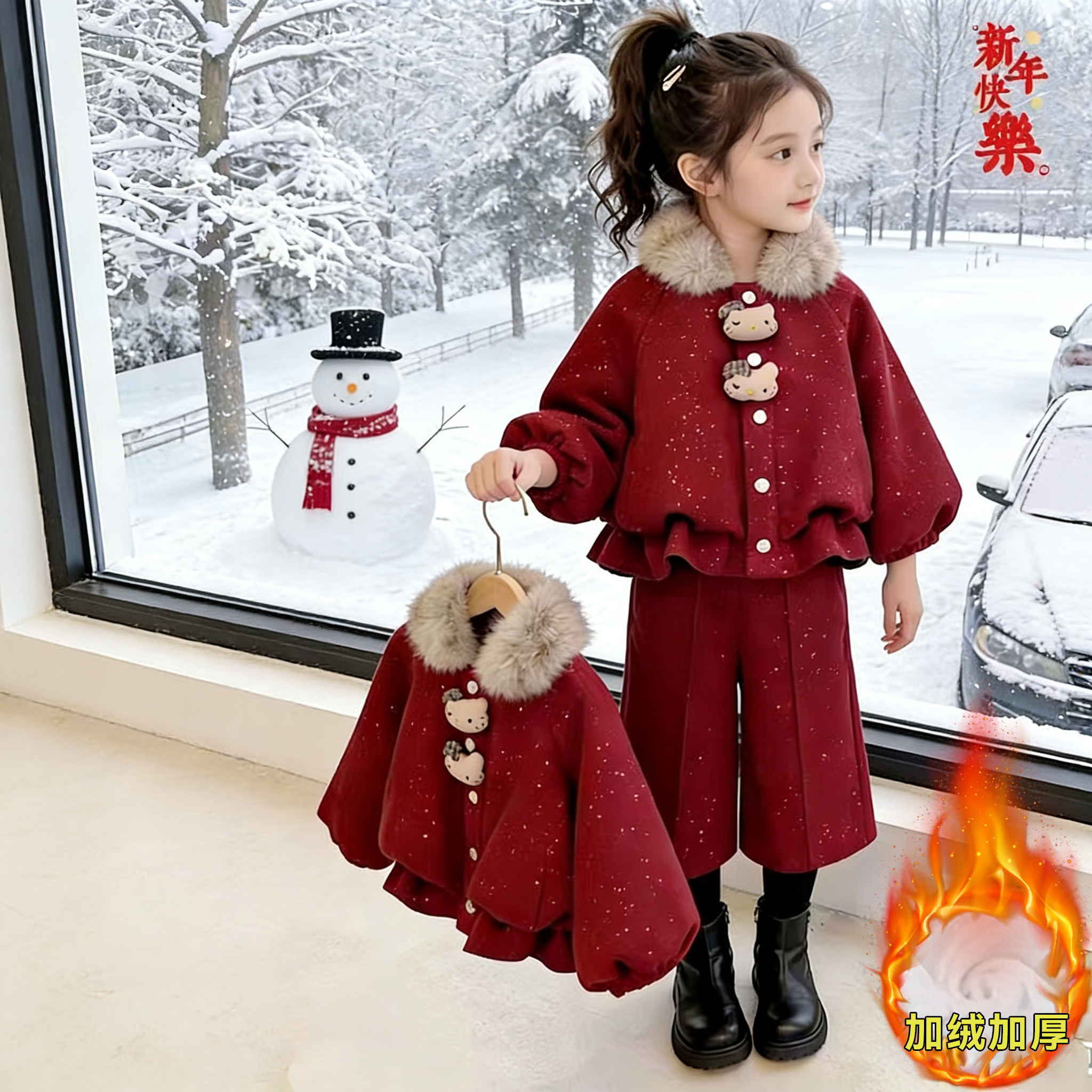 女童秋冬套装2026新款毛领棉服加绒洋气冬装女宝宝新年红色拜年服
