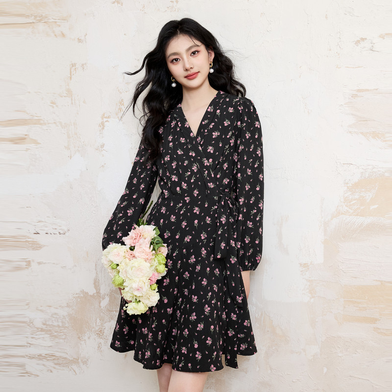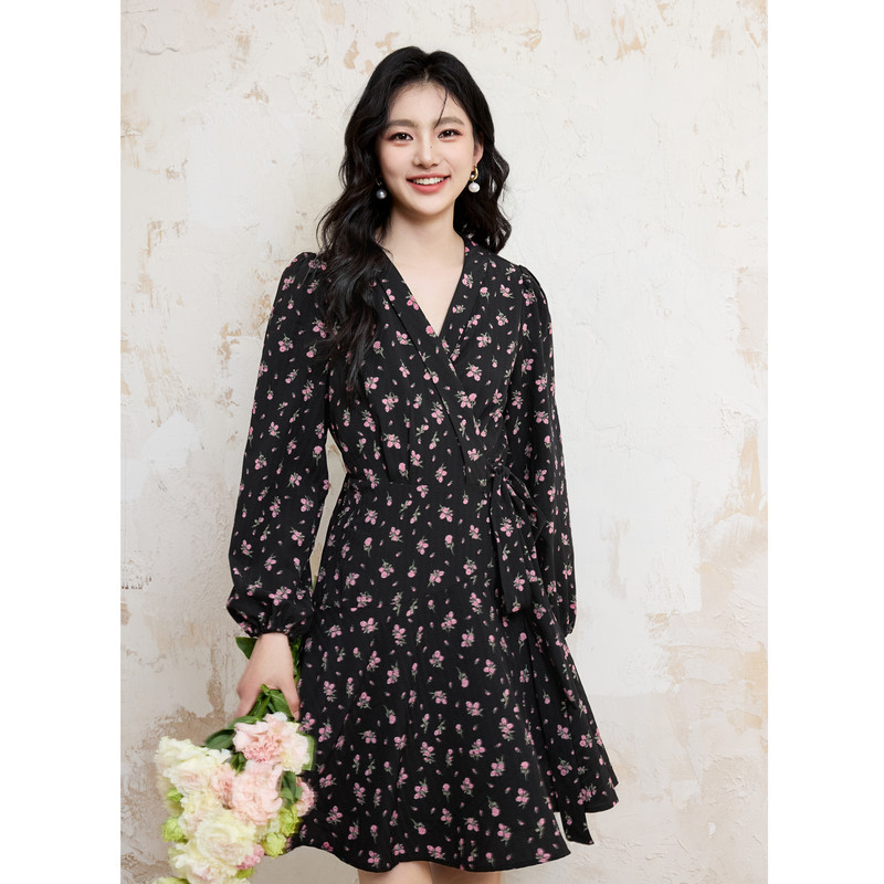 秋水伊人法式黑色碎花连衣裙女2025初秋新款小个子优雅复古中长裙