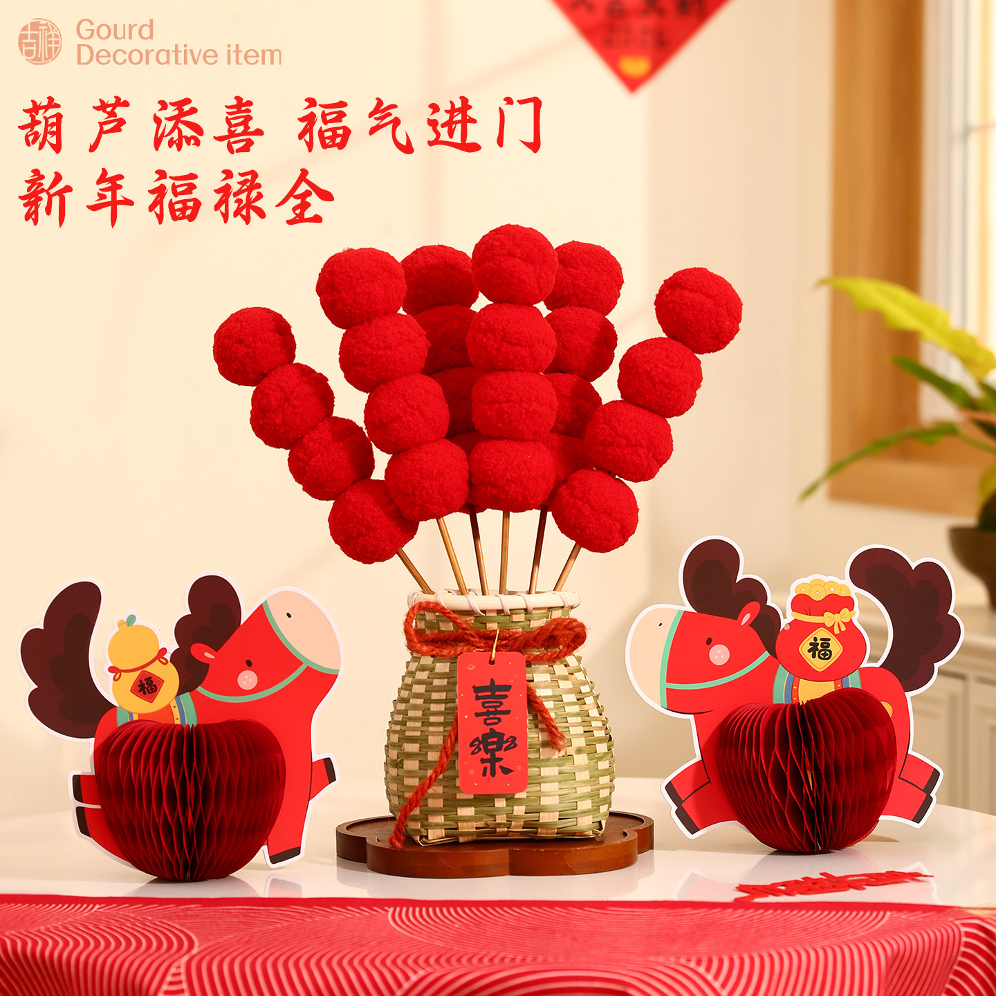 2026马年装饰品创意摆件新年毛绒糖葫芦竹编福桶桌面摆件春节布置
