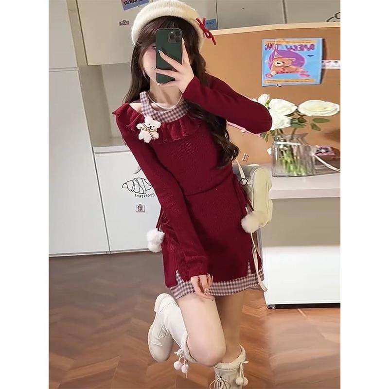 辣妹圣诞红色格子荷叶连衣裙长袖针织冬季新款收腰显瘦短裙裙子