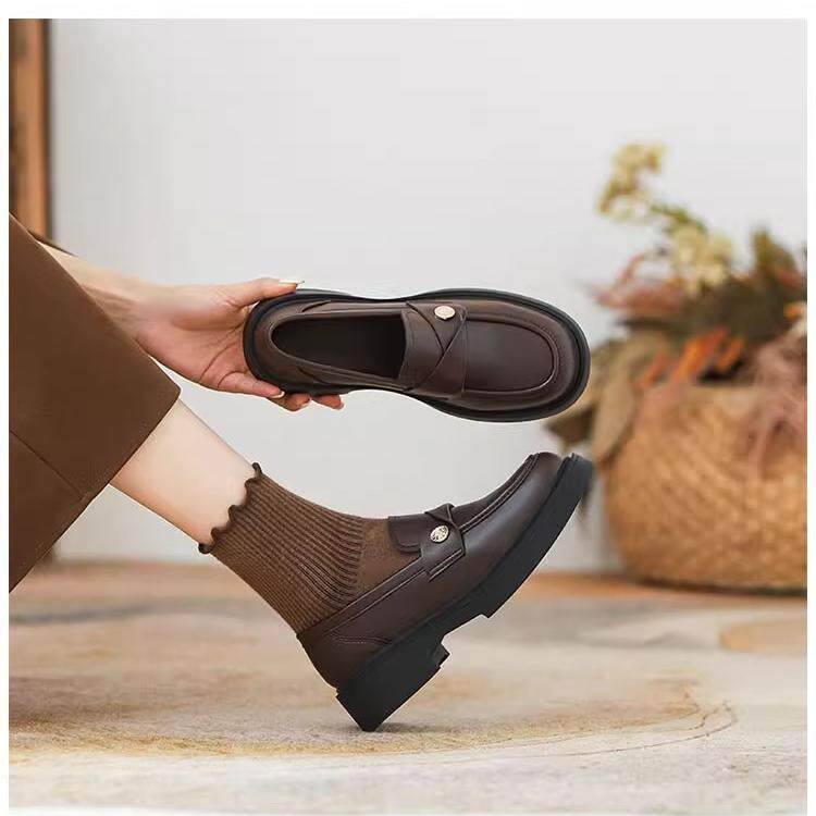品牌真皮金币乐福鞋女2025春秋新款厚底中跟单鞋棕色英伦风小皮鞋