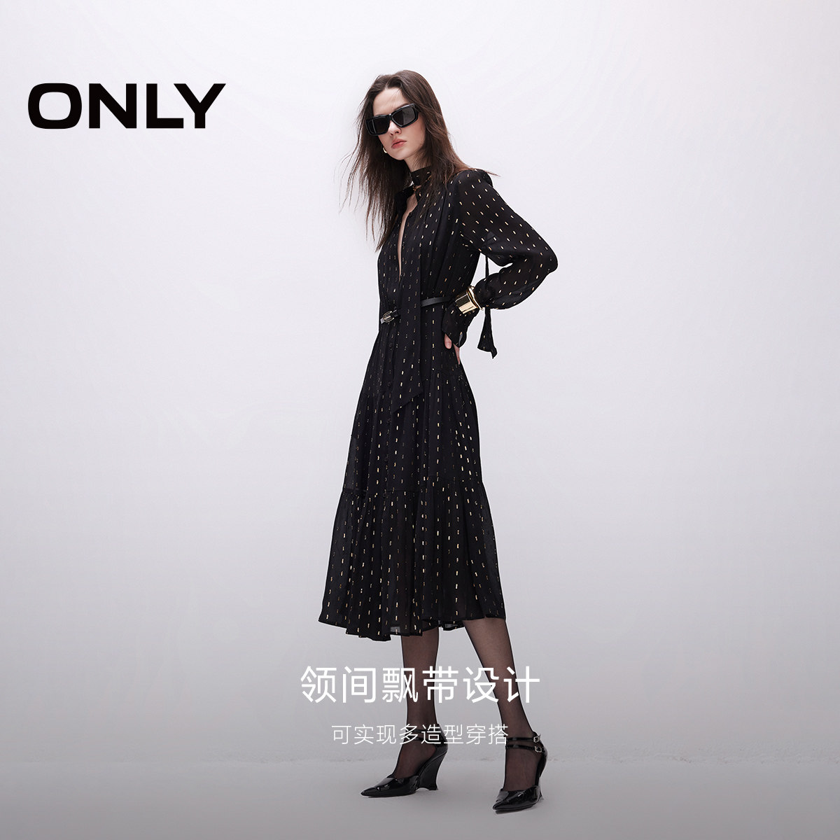 311线报网描述:闪亮金色印花 轻薄亲肤雪纺裙 优雅颈间飘带