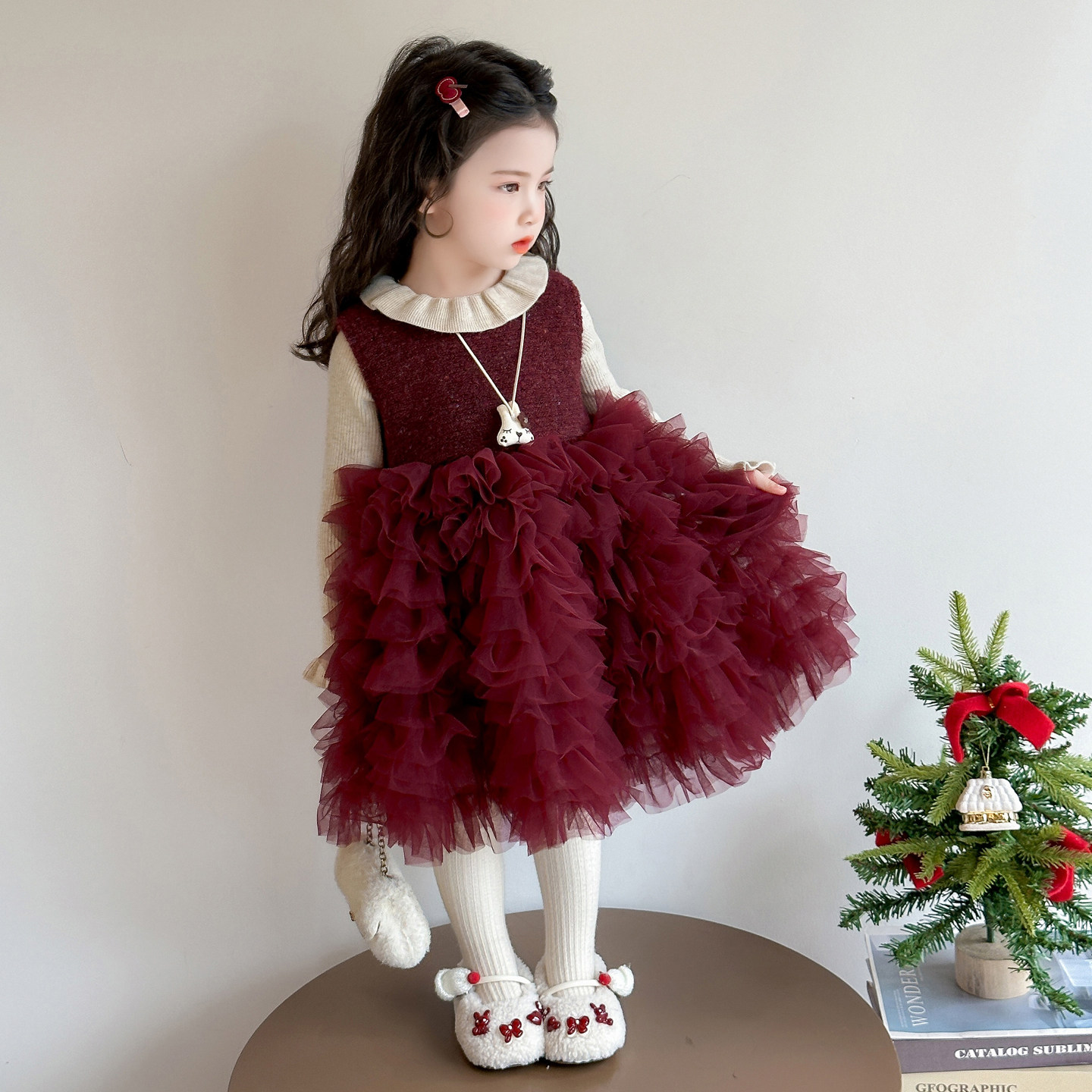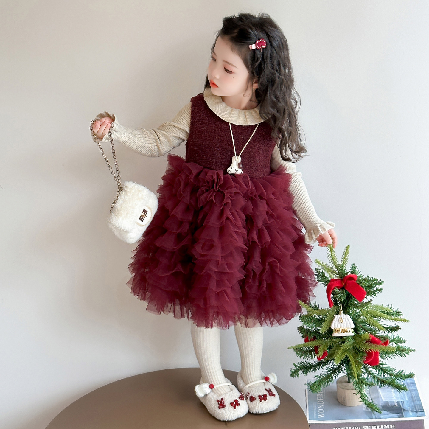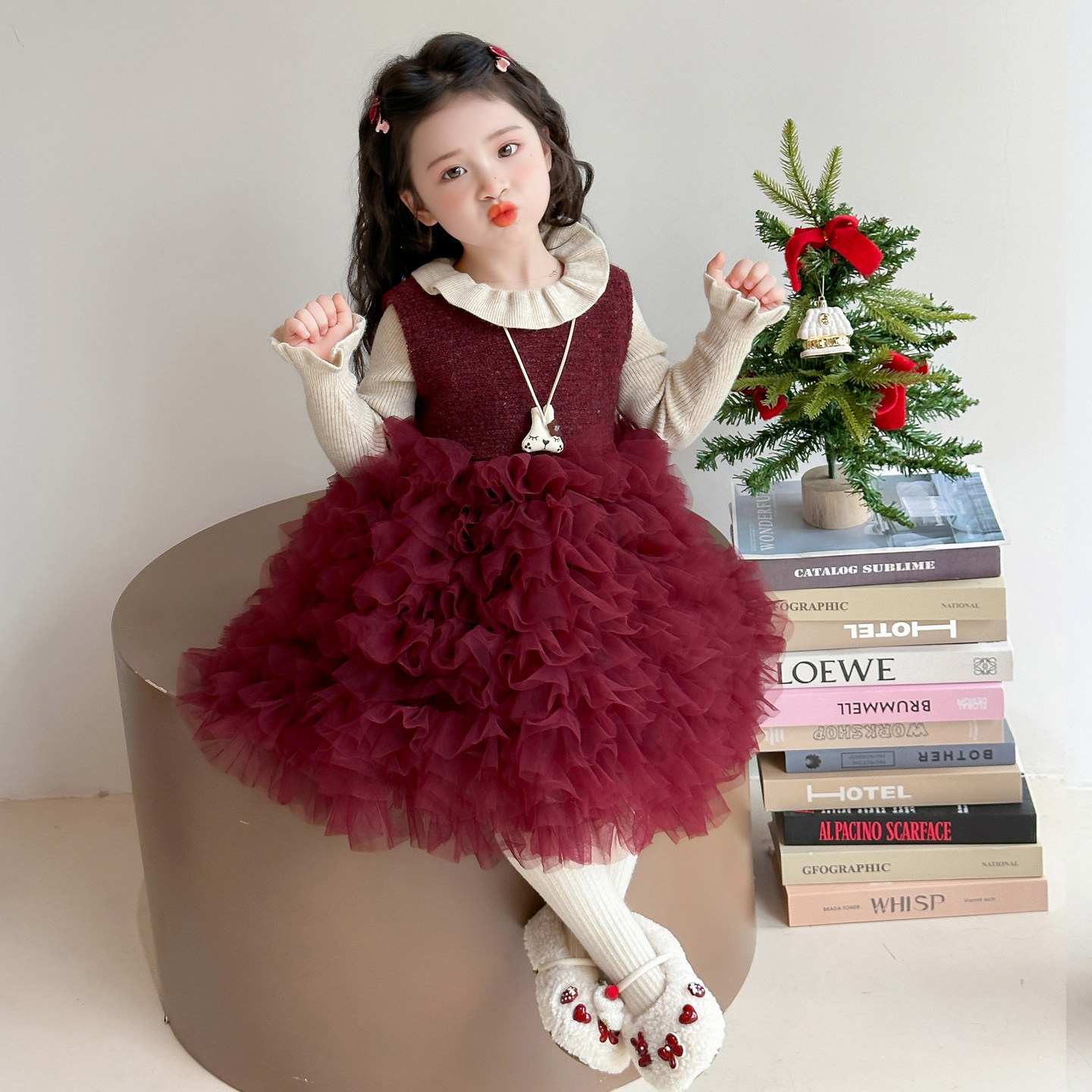 女童加绒红色连衣裙套装2025秋冬季新款女宝宝新年加厚裙子拜年服