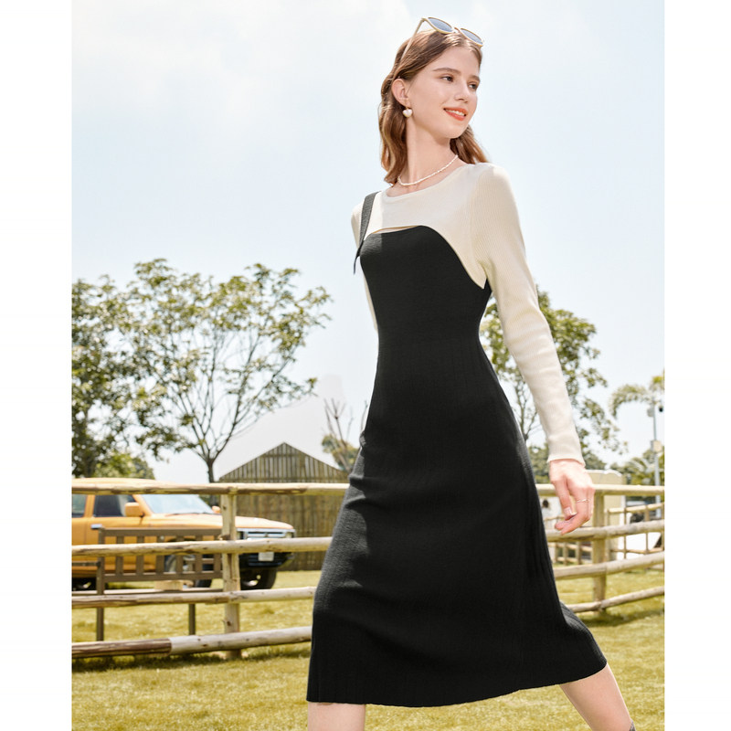 betu百图女装2026年春装新款镂空气质收腰假两件针织毛衣连衣裙