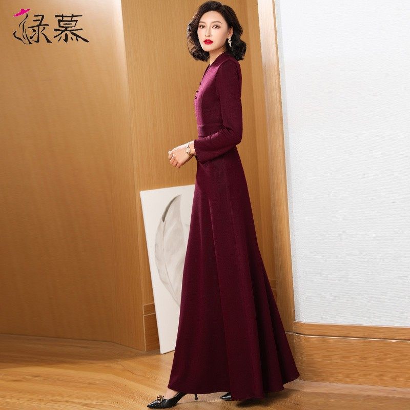 酒红色加绒加厚连衣裙修身长款2021冬季新款气质高端长裙到脚踝