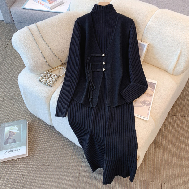 秋冬新款大码女装胖妈妈套装新中式开衫马甲针织连衣裙子两件套女