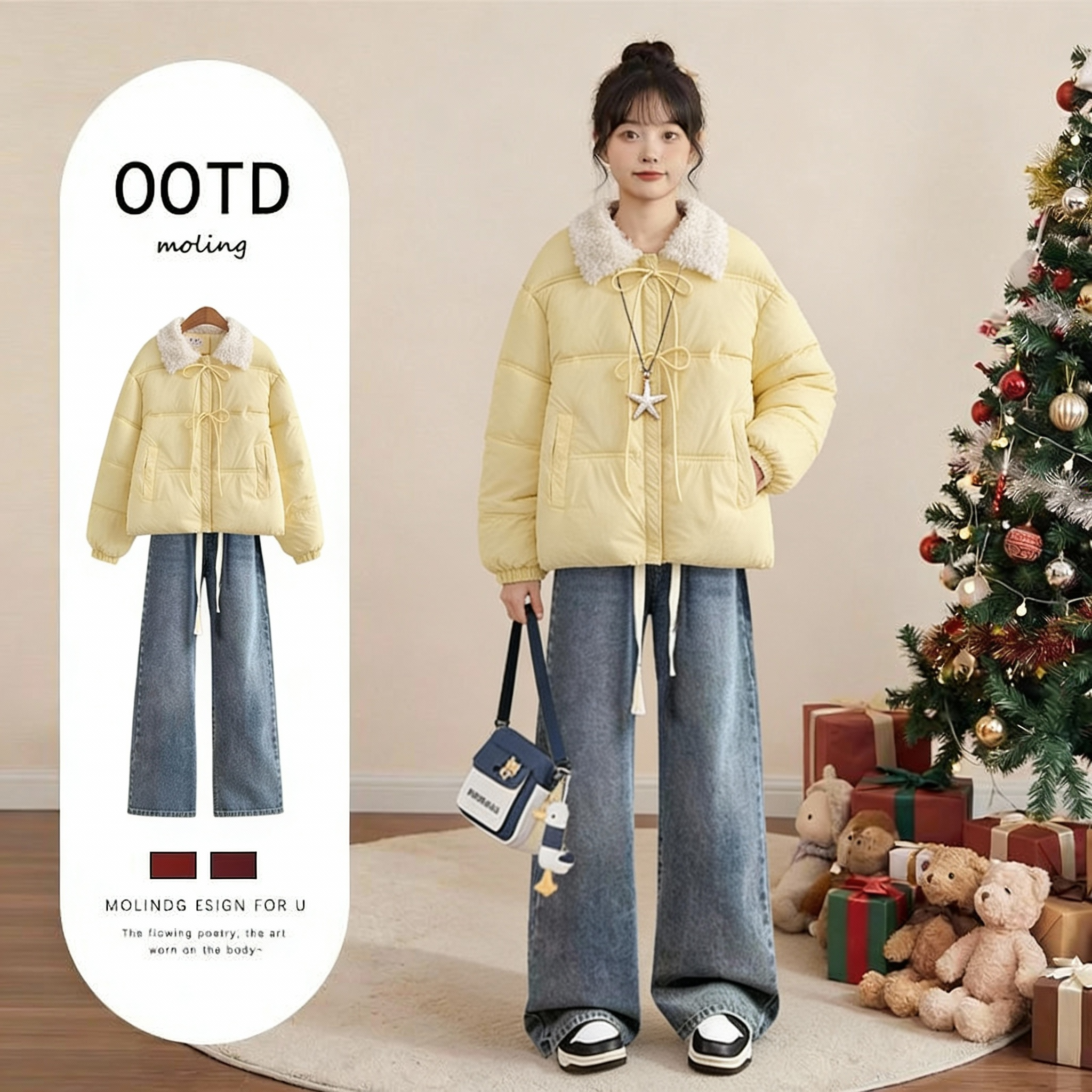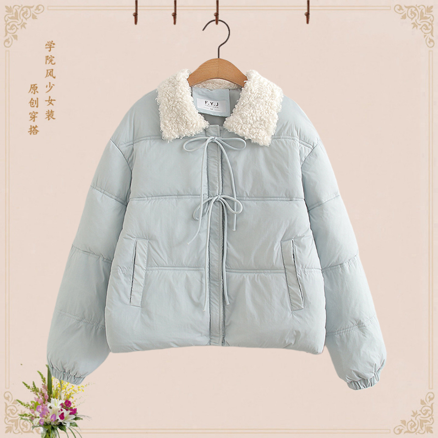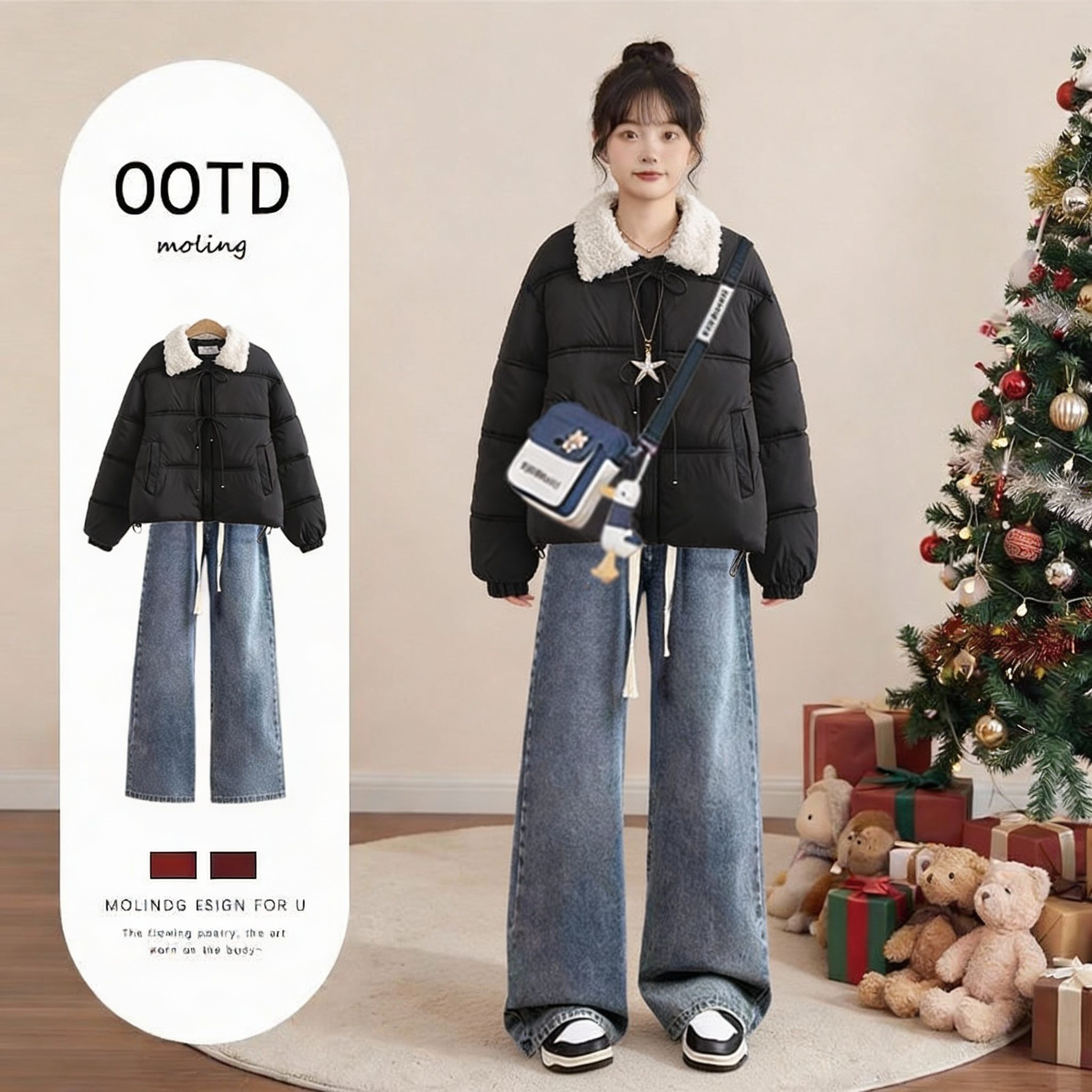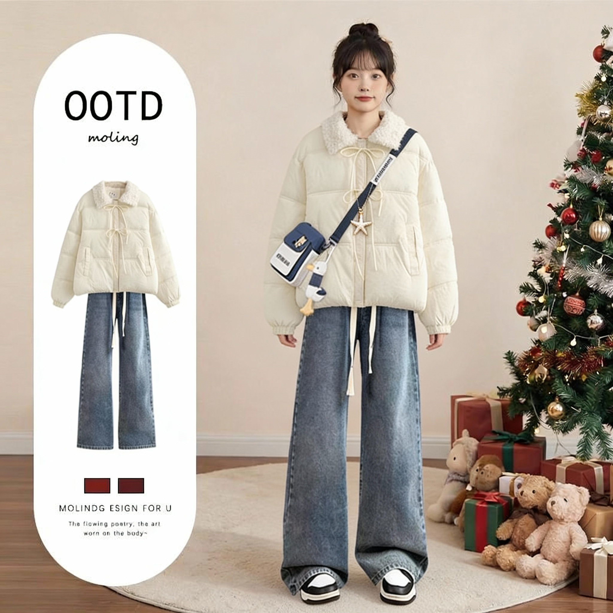 初中生少女两件套装冬季新款学生小清新羊羔毛棉服加绒牛仔裤套装