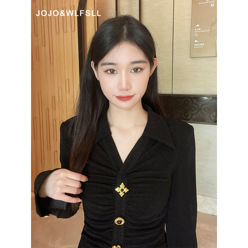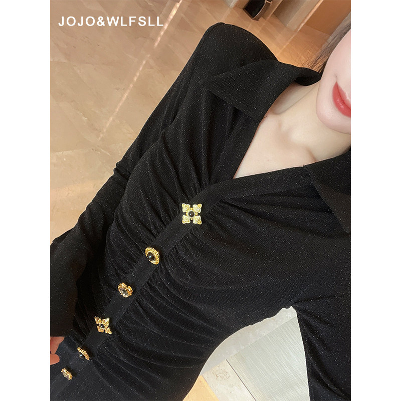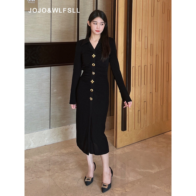 JOJO&WLFSLL黑色V领高端针织连衣裙2026春季新款高级感修身包臀裙