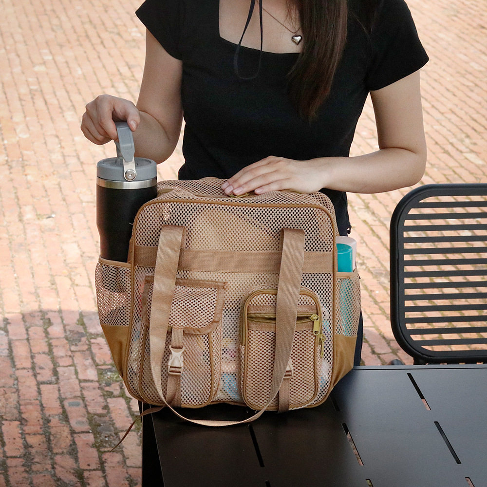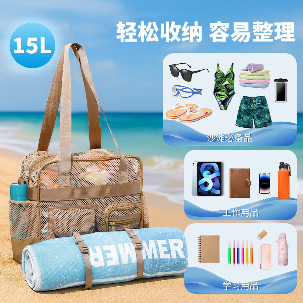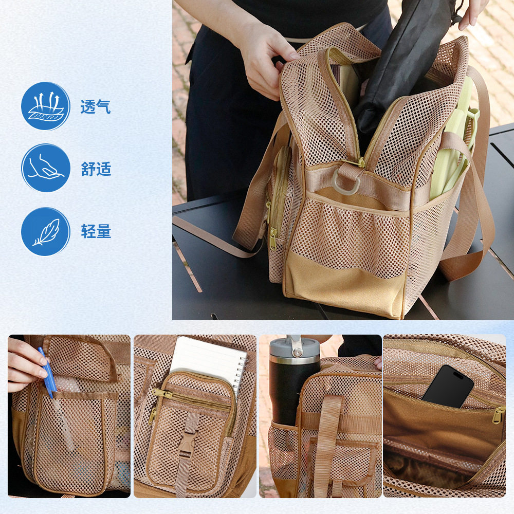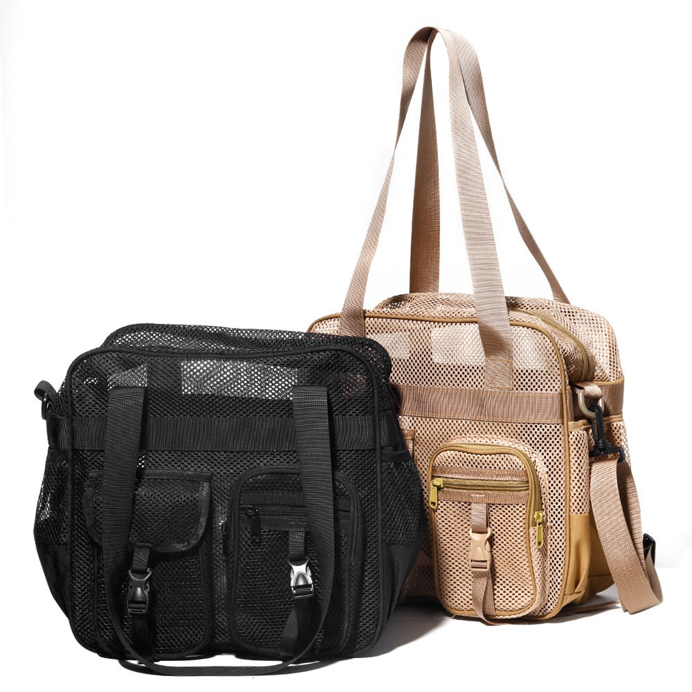 现货女款网纱多口袋单肩斜挎包透气休闲百搭网眼包大容量沙滩包