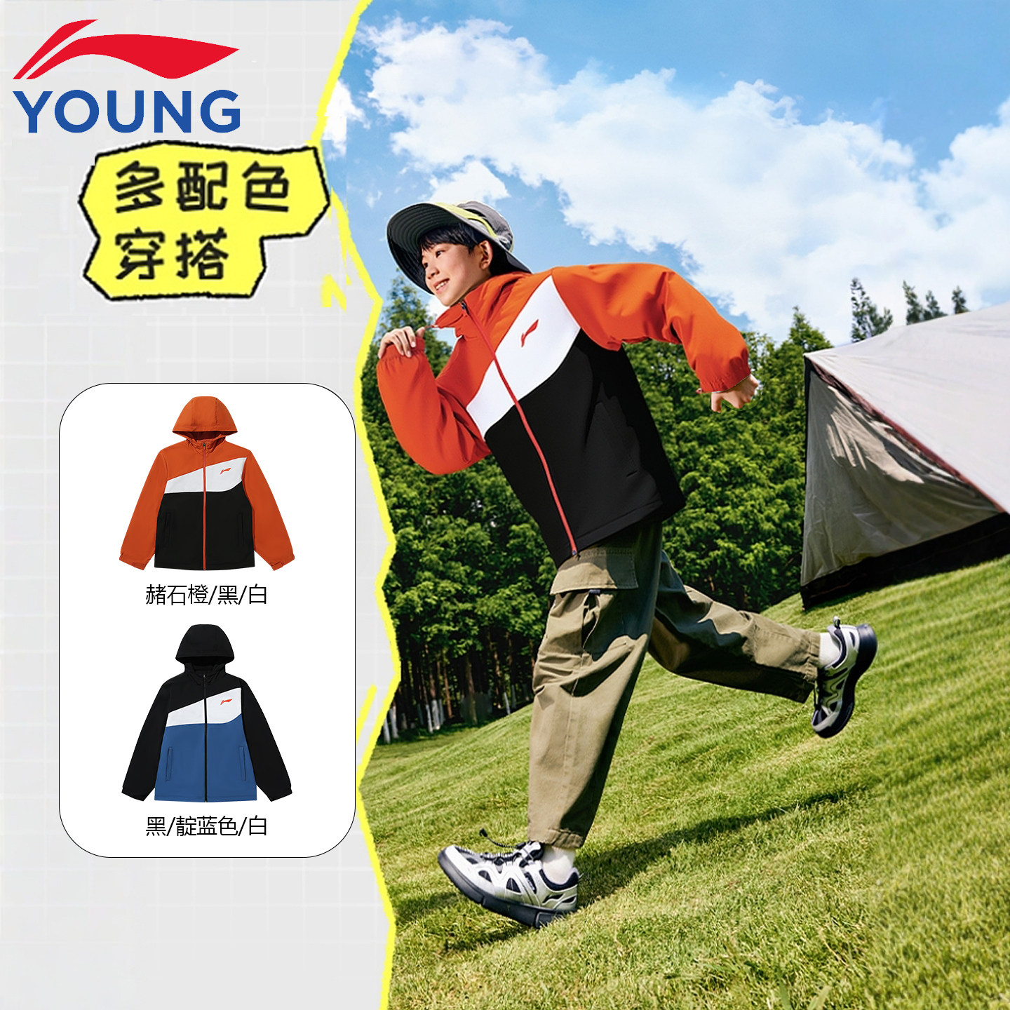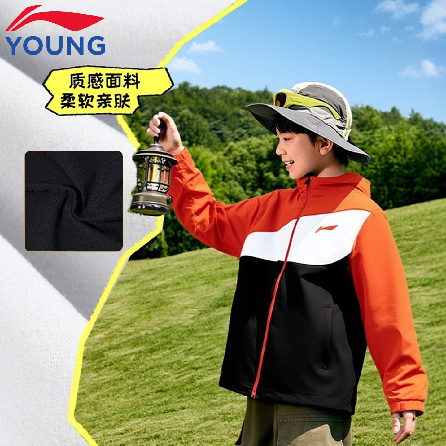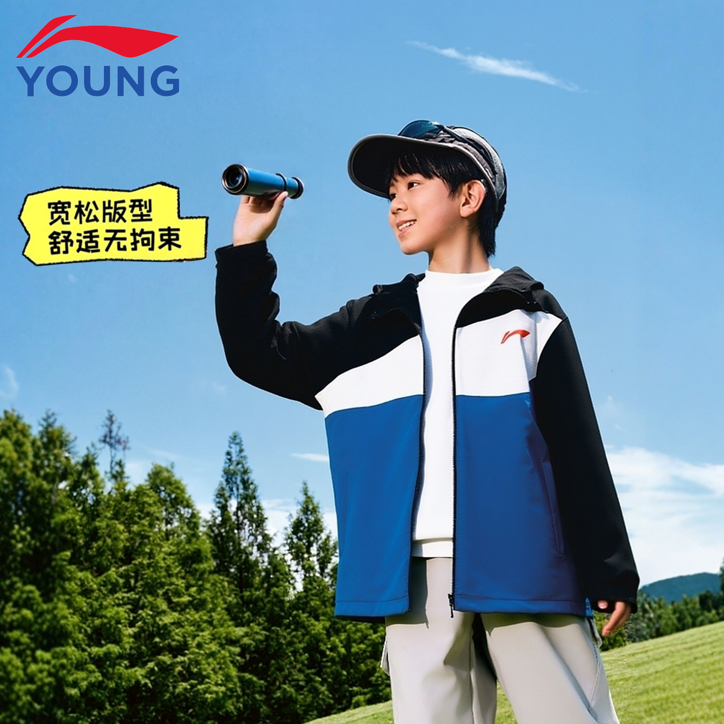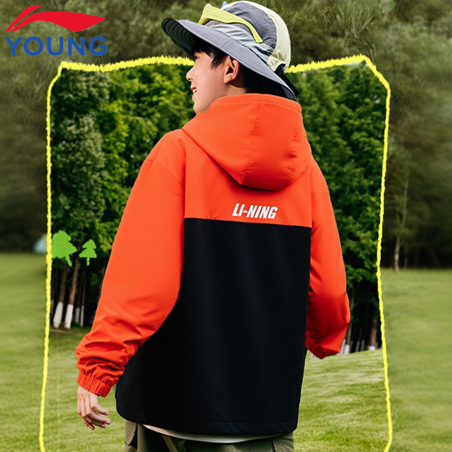 李宁儿童运动风衣男大童2026春季新款青少年宽松加绒连帽软壳外套