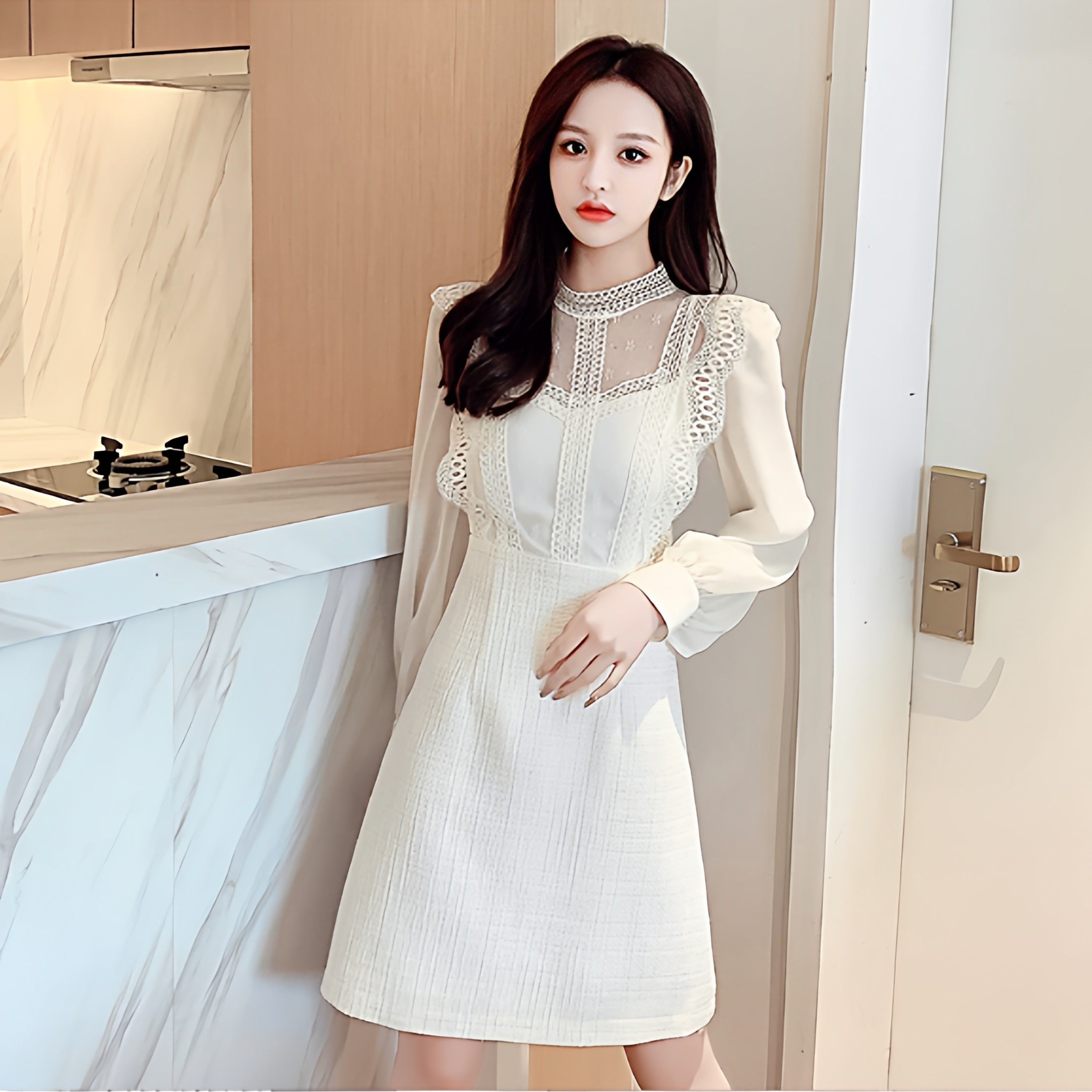 2023秋冬季法式新款小香风小个子气质减龄A字拼接长袖蕾丝连衣裙