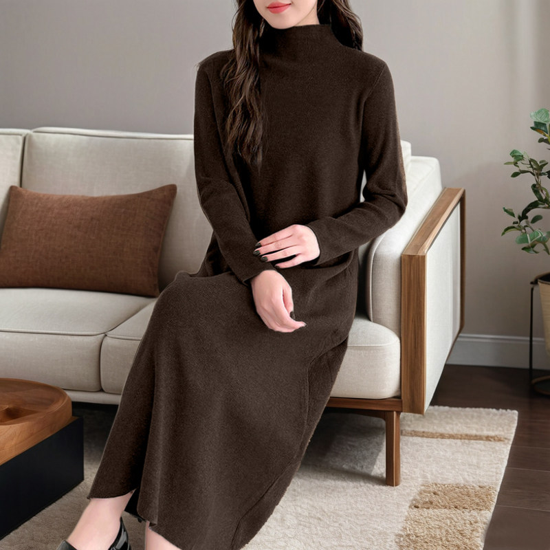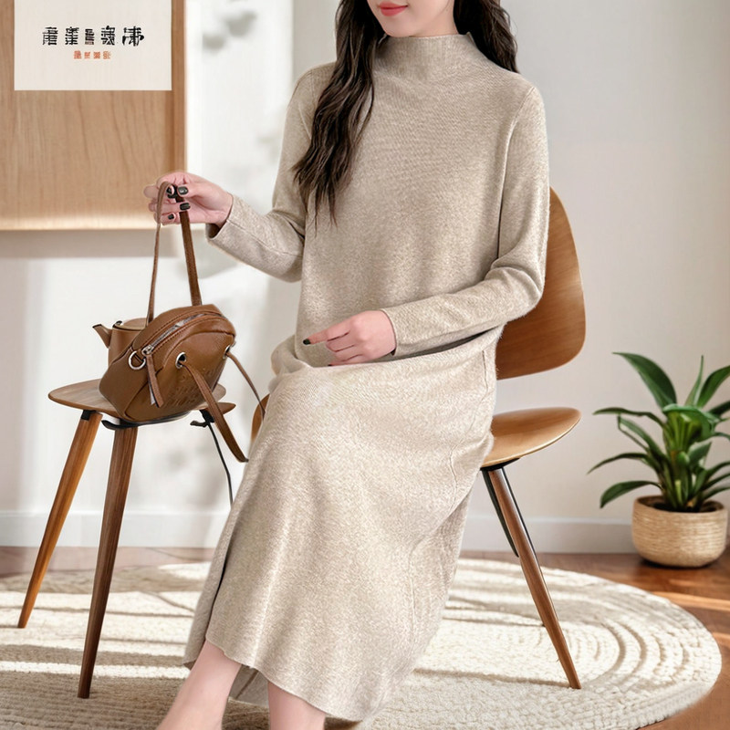 半高领秋冬女连衣裙毛衣裙过膝针织加长款内搭打底加绒加厚一体绒