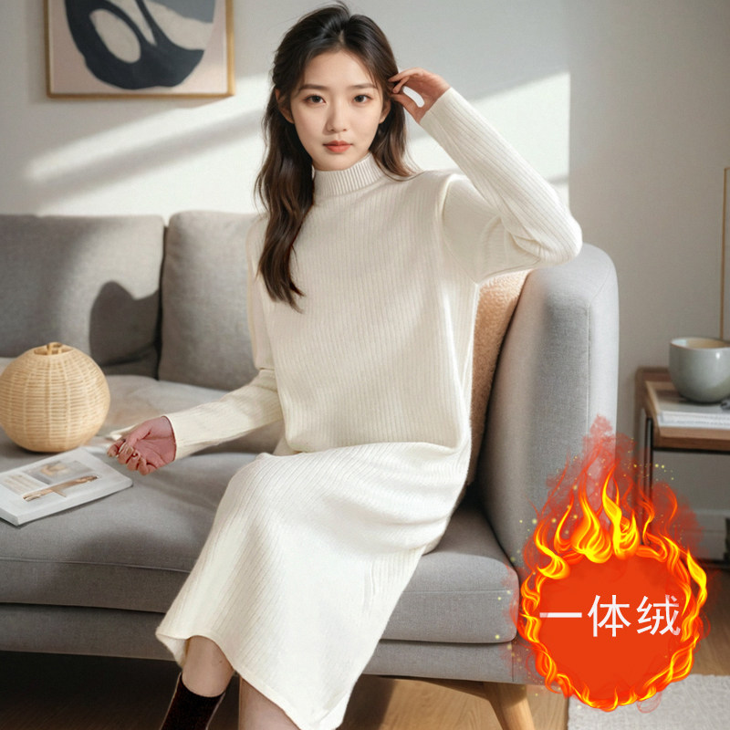 红色一体绒加绒加厚冬季毛衣连衣裙女长款过膝针织内搭打底半高领