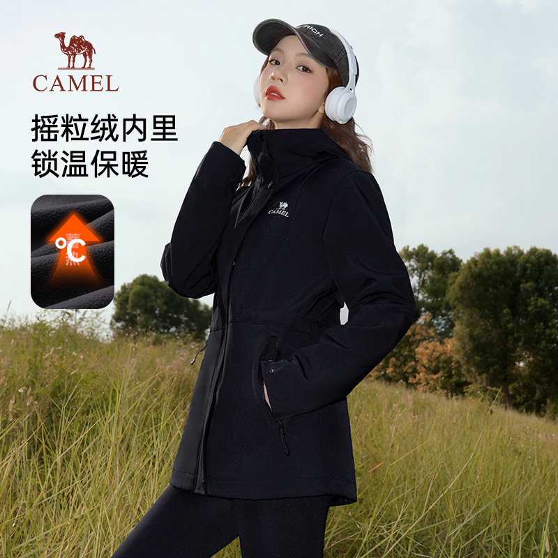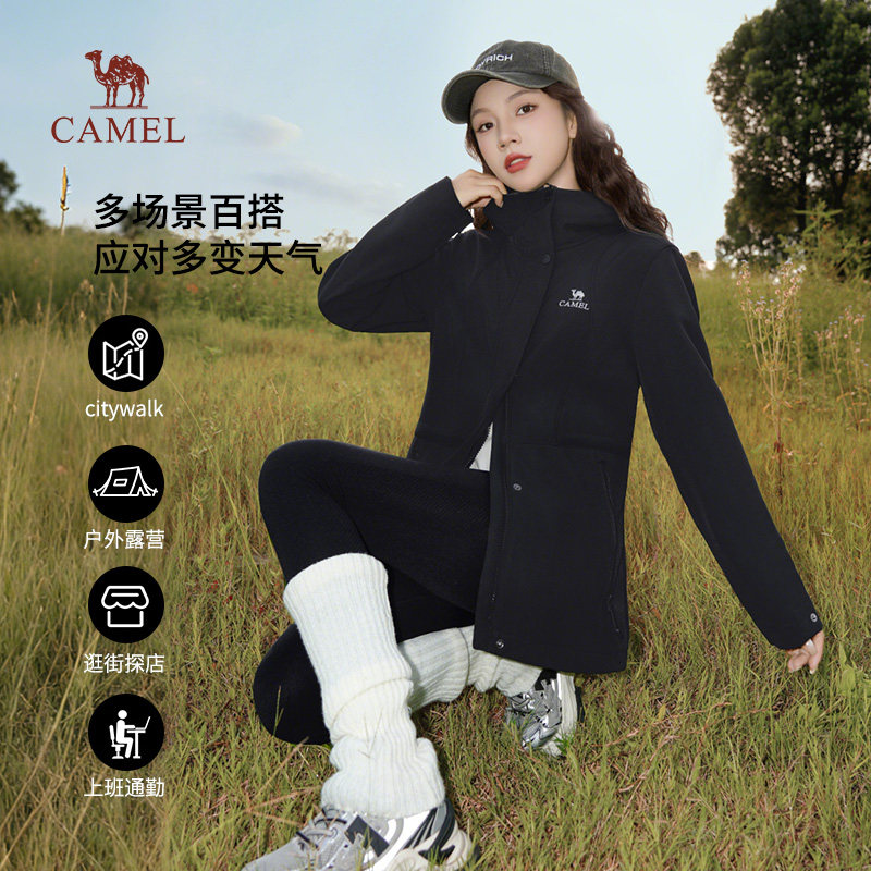 骆驼女装中长款软壳冲锋衣2026秋冬新款休闲百搭收腰显瘦外套