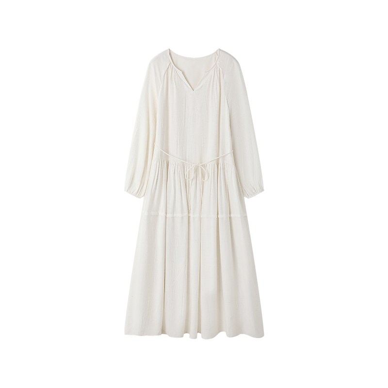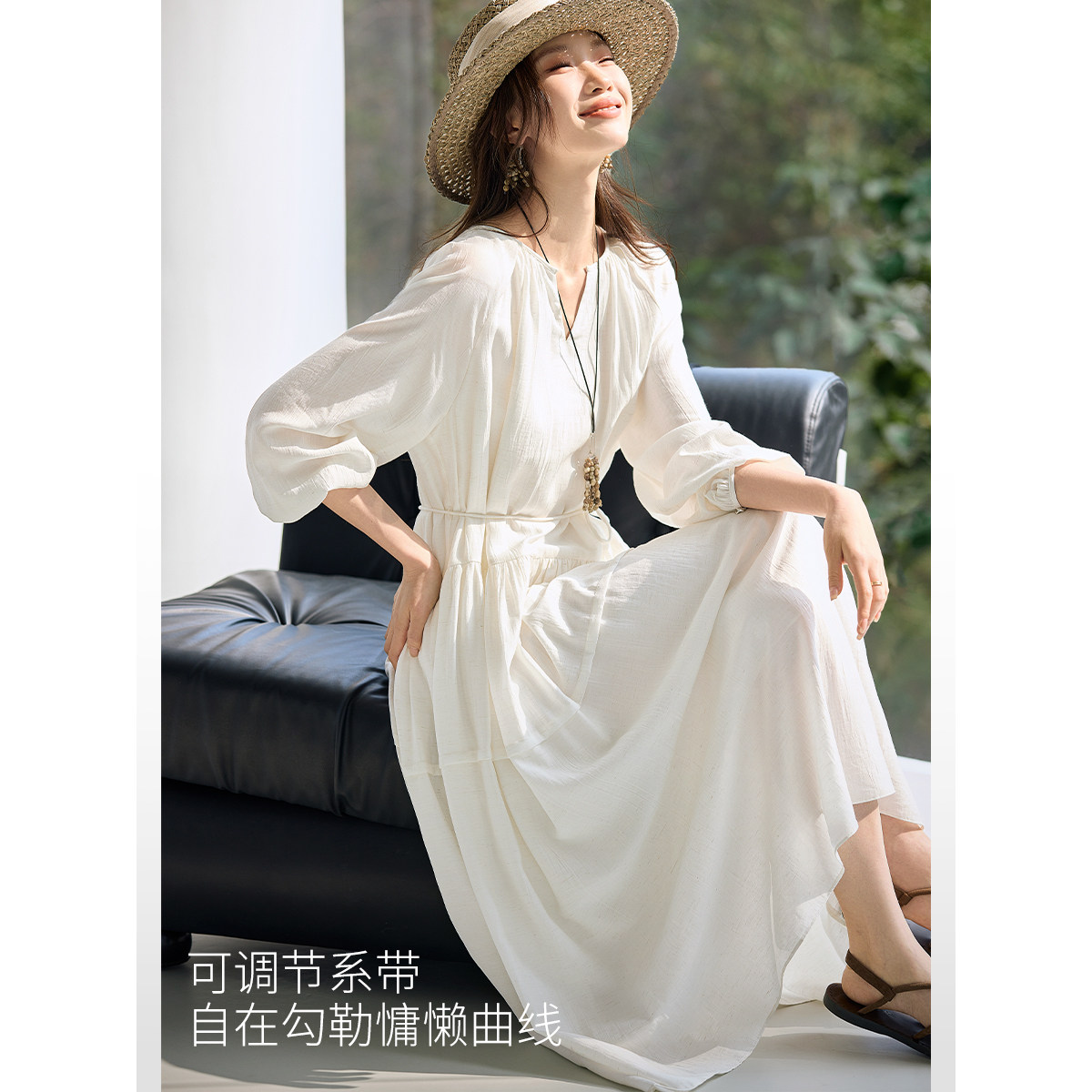 沫晗依美含亚麻奶油裙2026春季新款法式气质飘逸感长款连衣裙女士