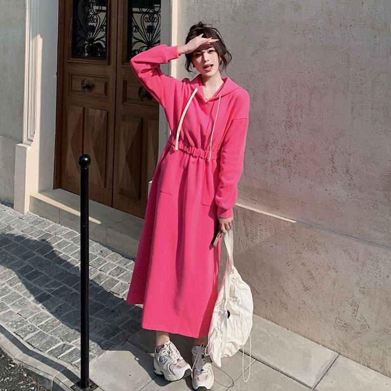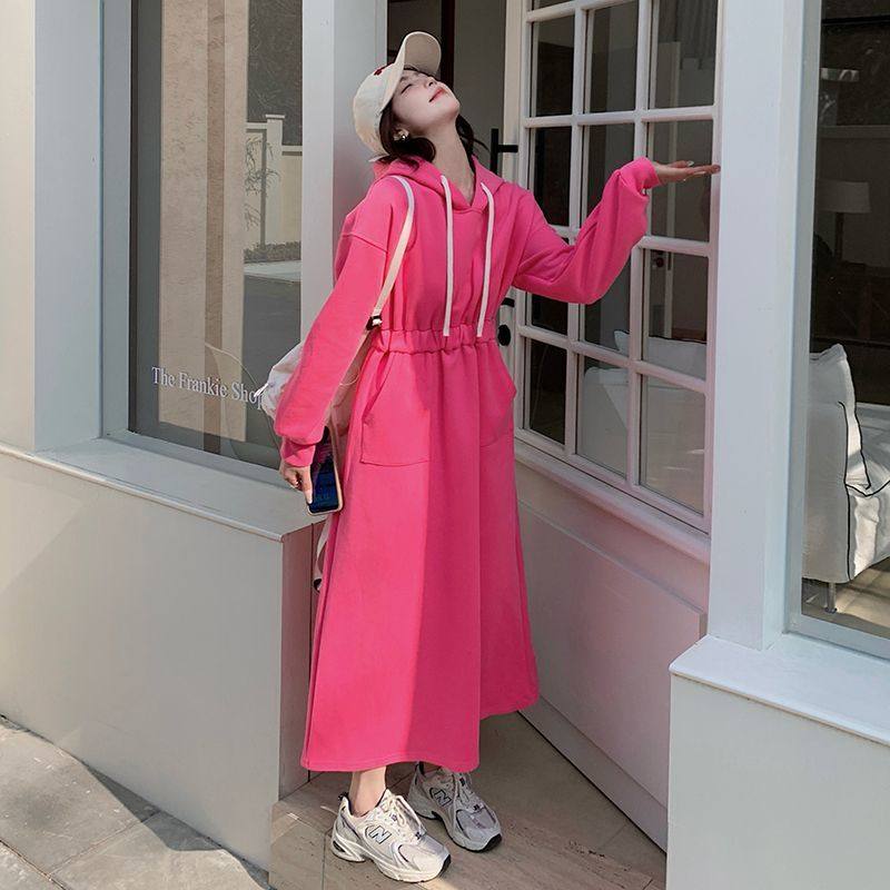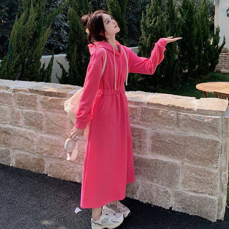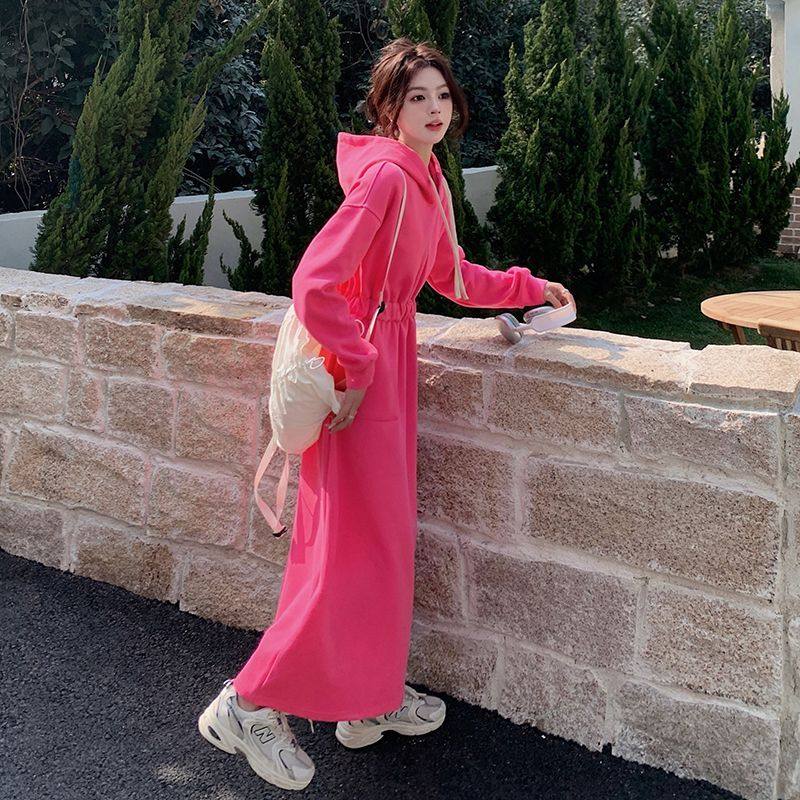长款连帽卫衣连衣裙女秋冬季大码胖mm宽松气质减龄高级百搭长裙子