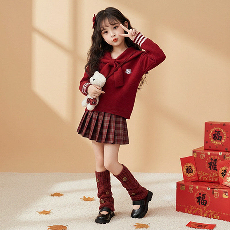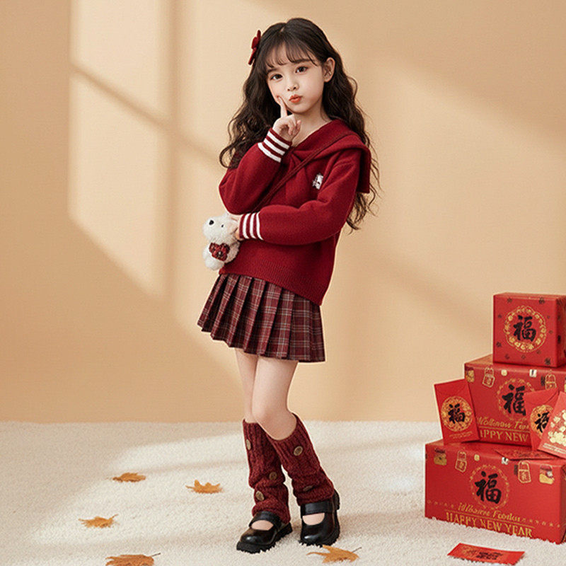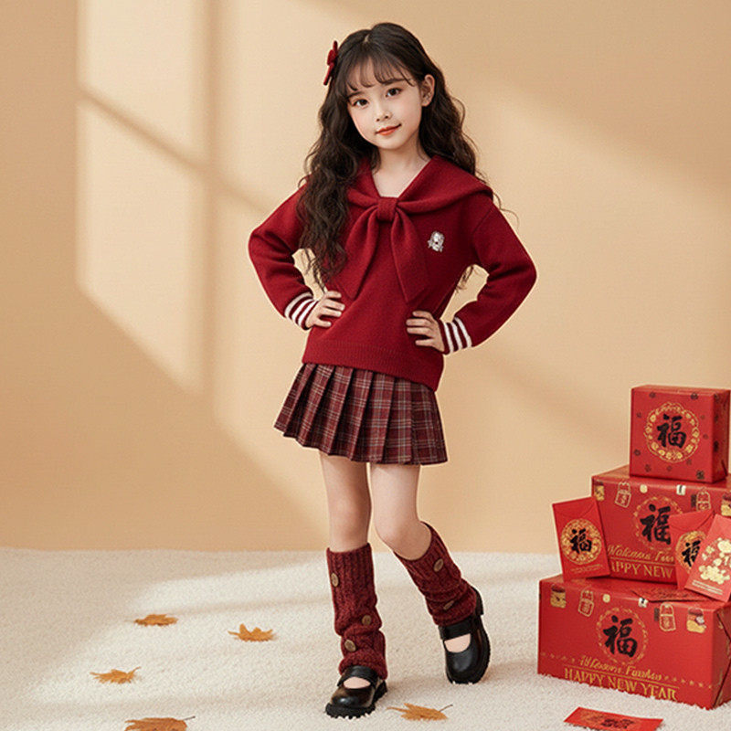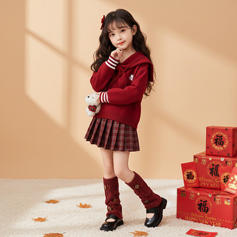 女童连衣裙子冬装2026新款超好看的女大童学院风过年红色毛衣套装