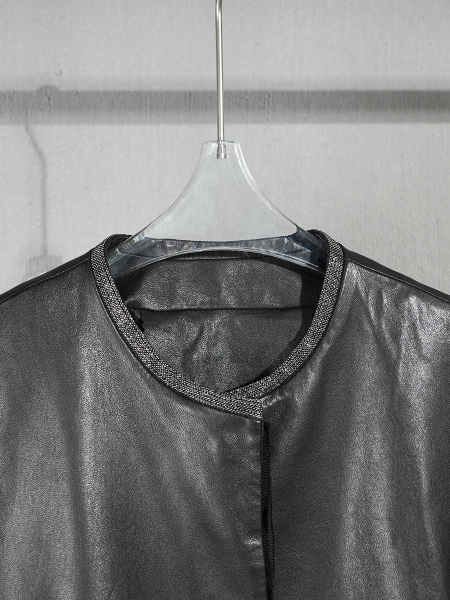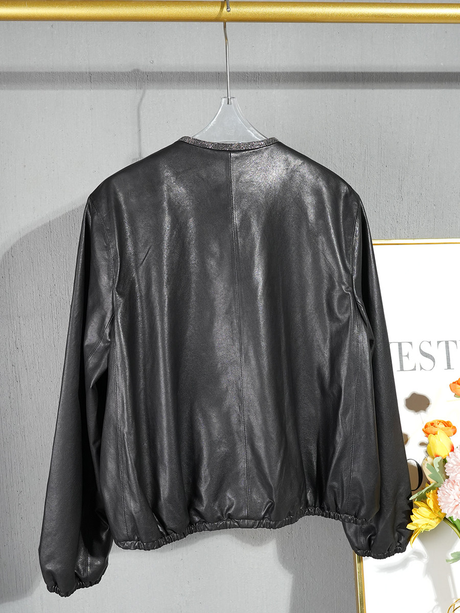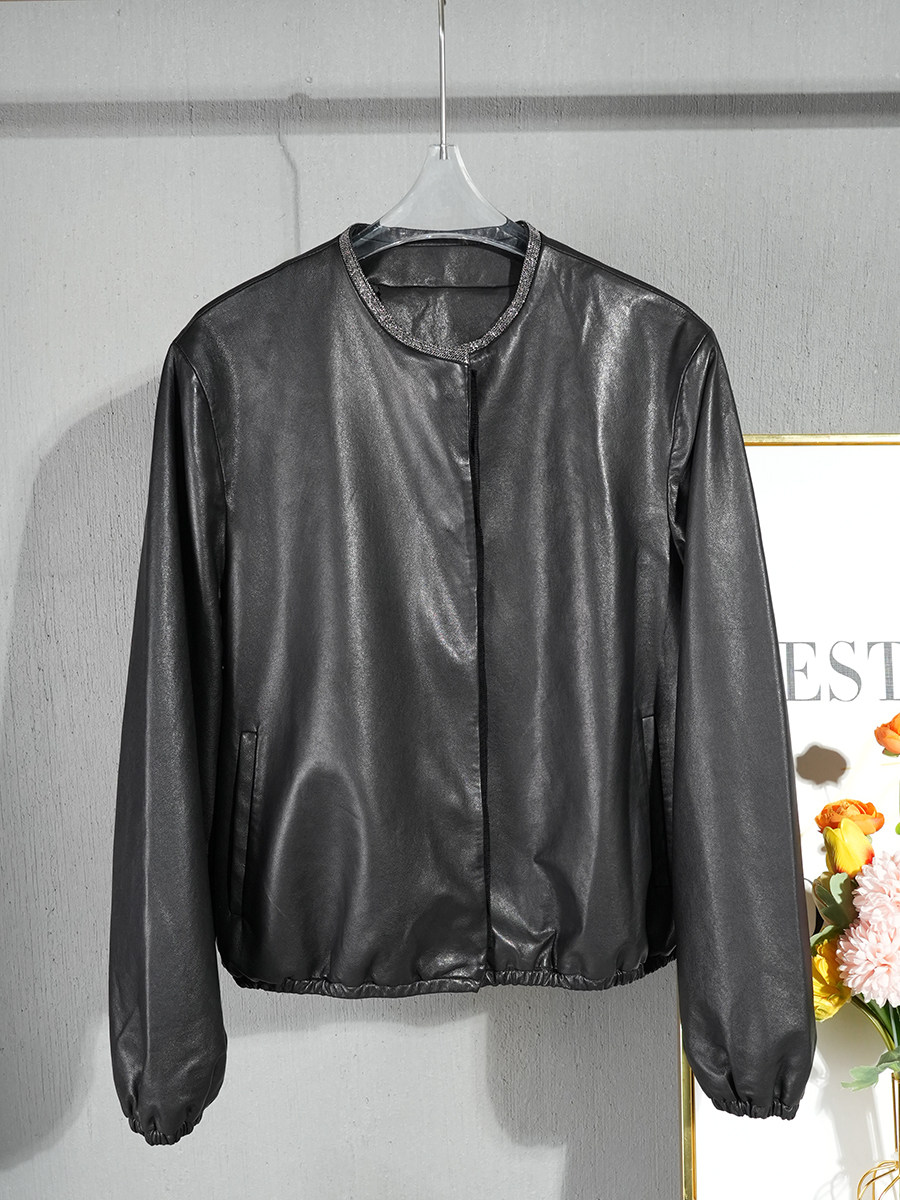 薄款进口全植鞣绵羊皮皮衣外套女2024春秋宽松圆领通勤真皮皮夹克