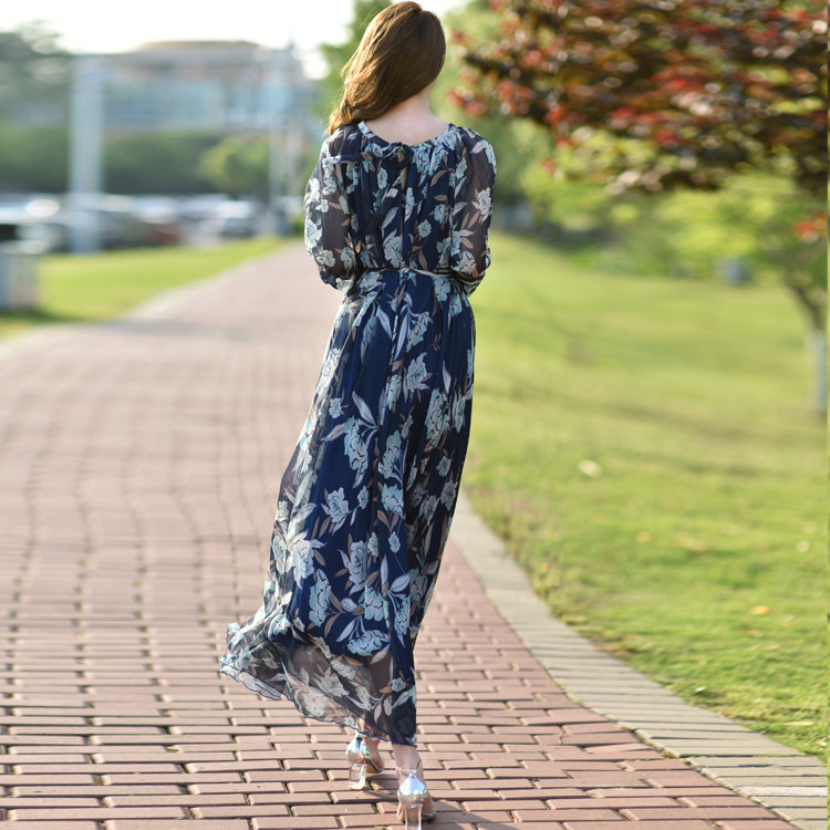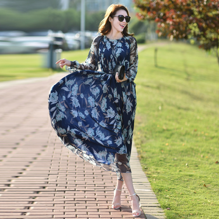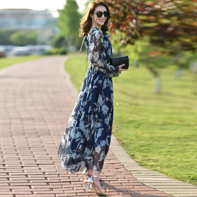 长裙夏连衣裙长袖大码女新款气质雪纺仙气沙滩裙大摆显瘦裙子