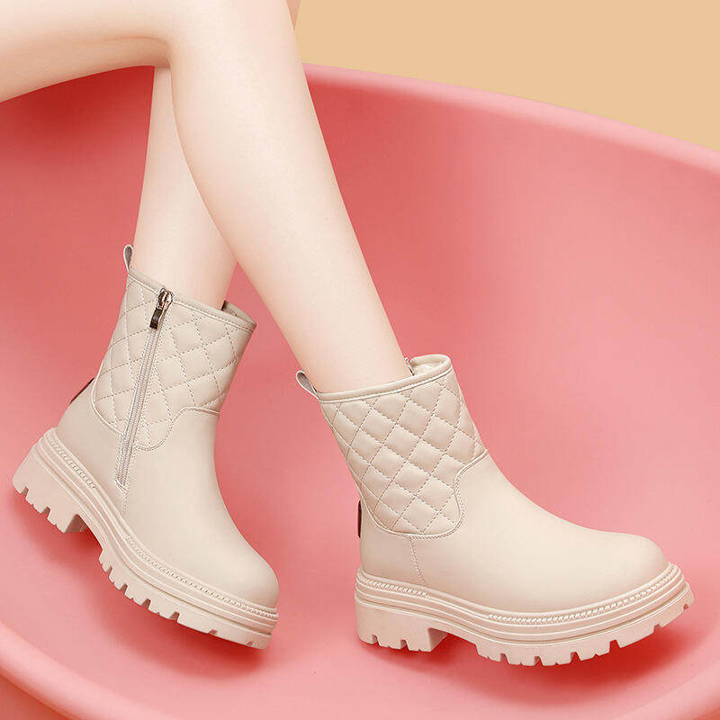 品牌撤柜真皮厚底雪地靴女25新款冬季加绒保暖白色短靴菱格纹棉鞋