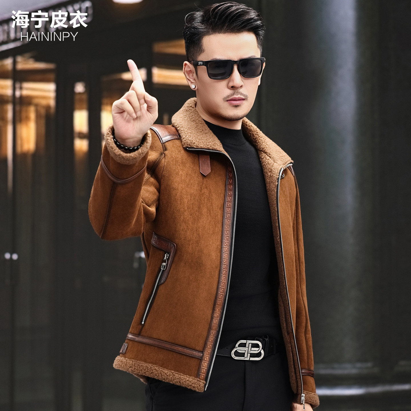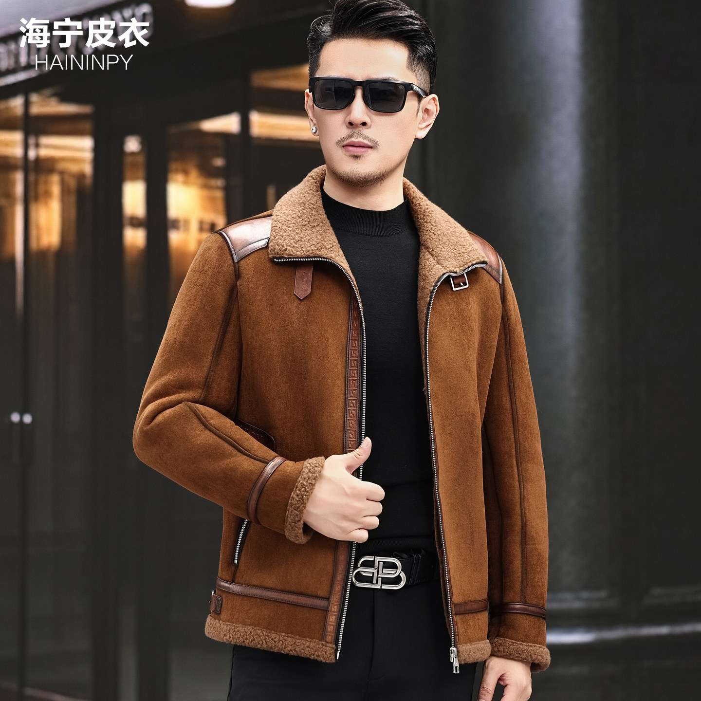 头层皮海宁真皮皮衣男皮毛一体加绒加厚羊羔毛爸爸装皮夹克男外套