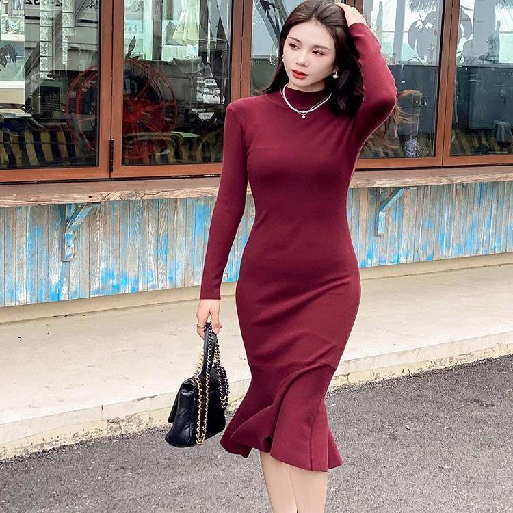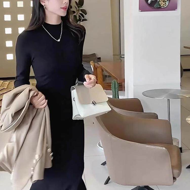 赫本风黑色半高领长袖针织连衣裙女秋季修身显瘦内搭开叉鱼尾裙
