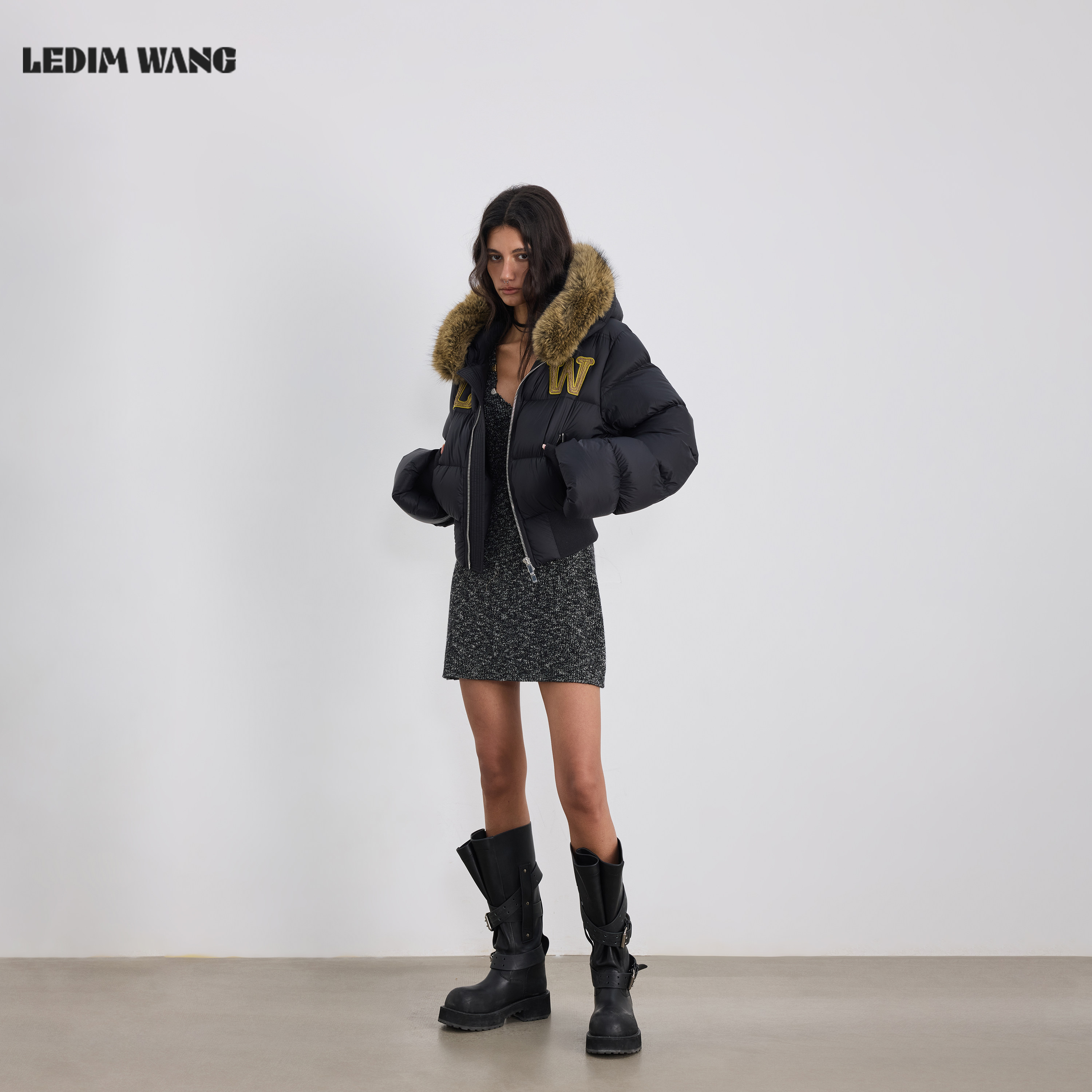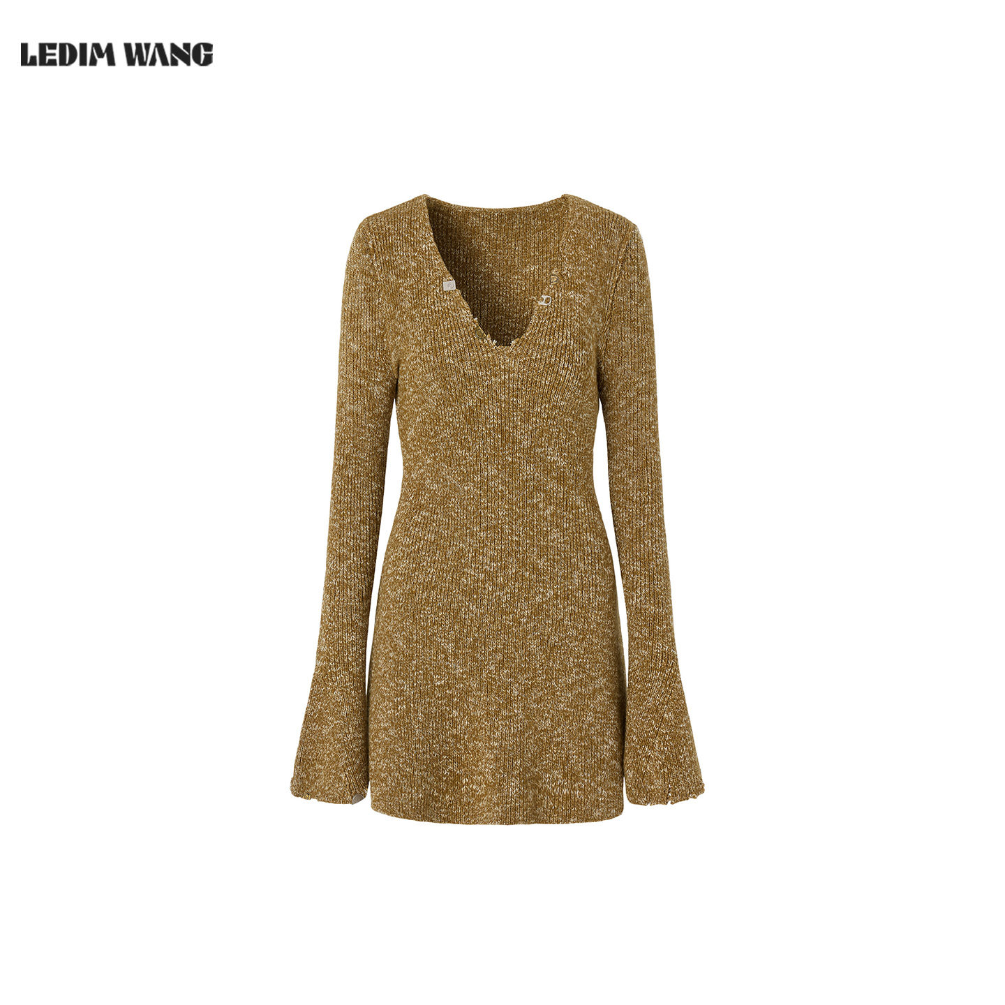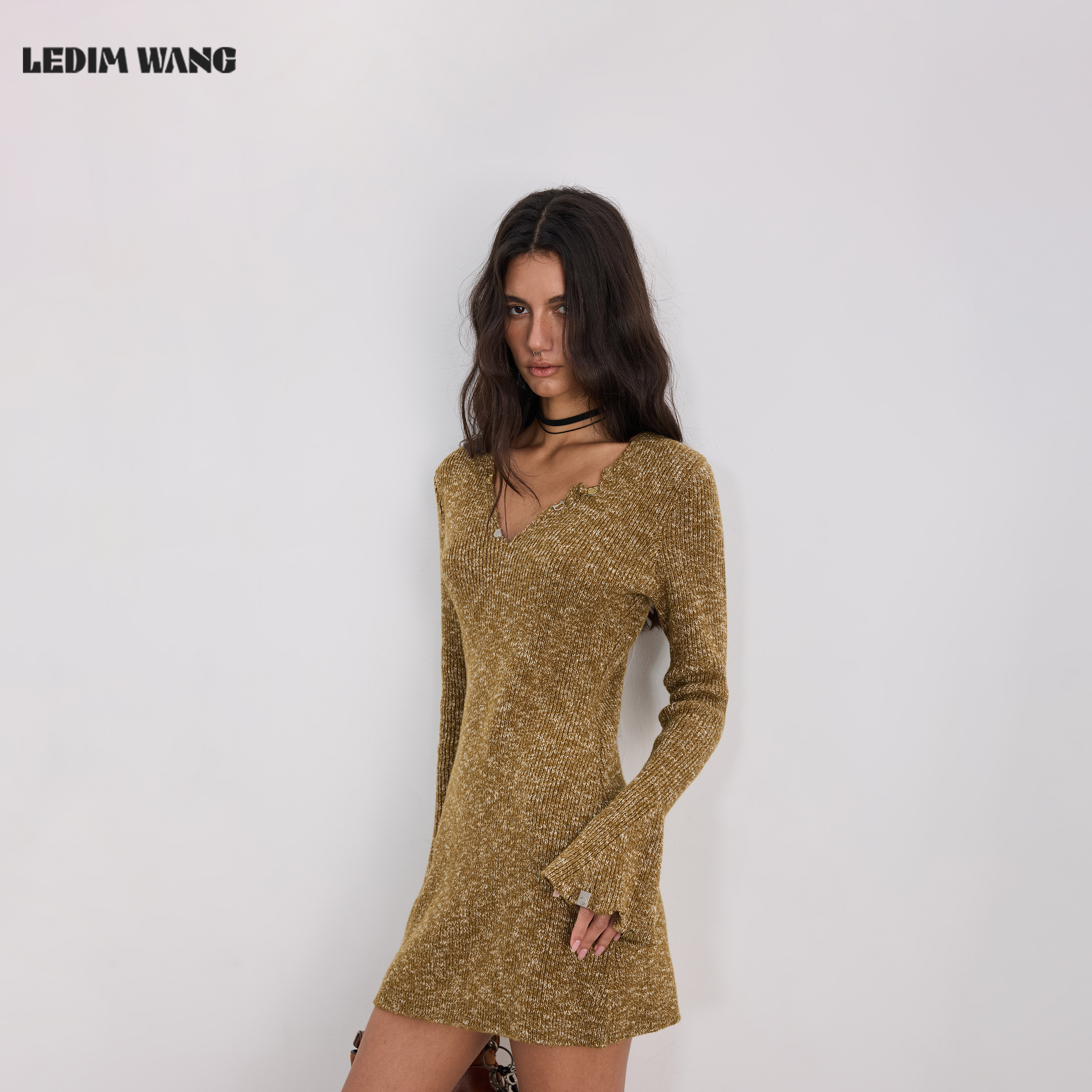 LEDIM WANG甜酷混色针织长袖连衣裙女25秋冬新款秋香色修身短裙