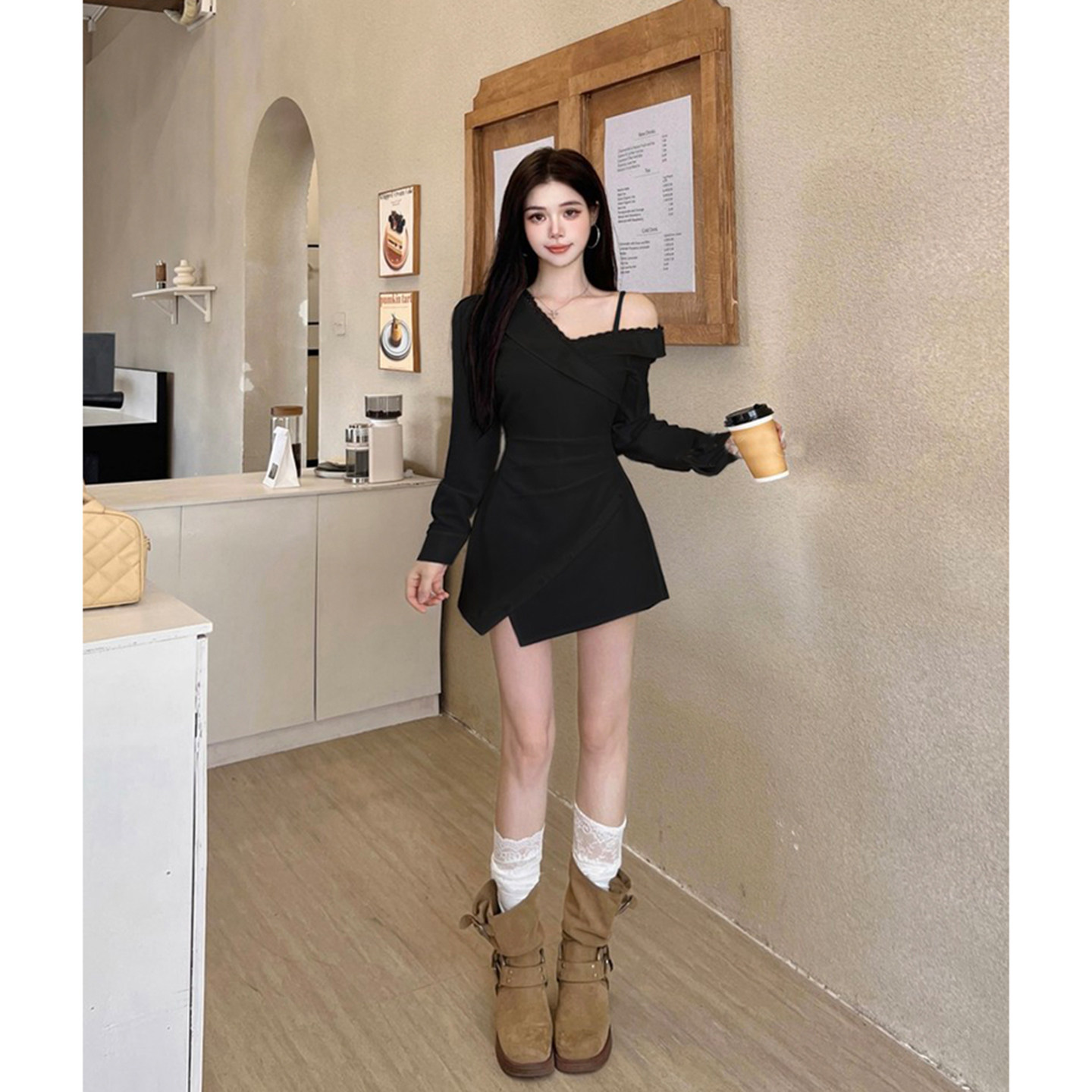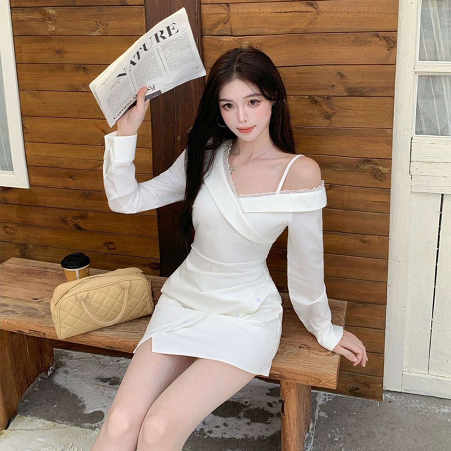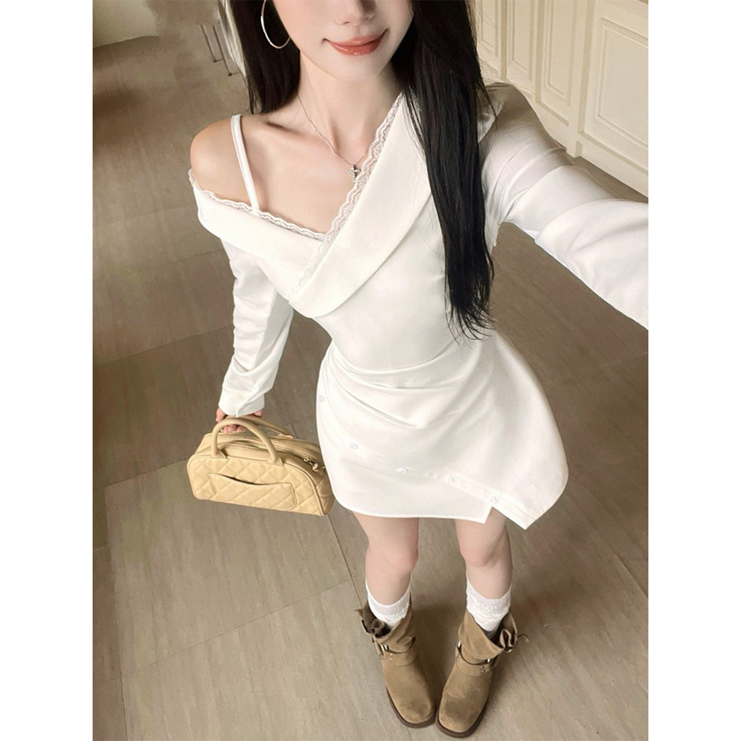 性感纯欲风吊带露肩设计长袖白色连衣裙女秋季绝美不规则抽褶短裙